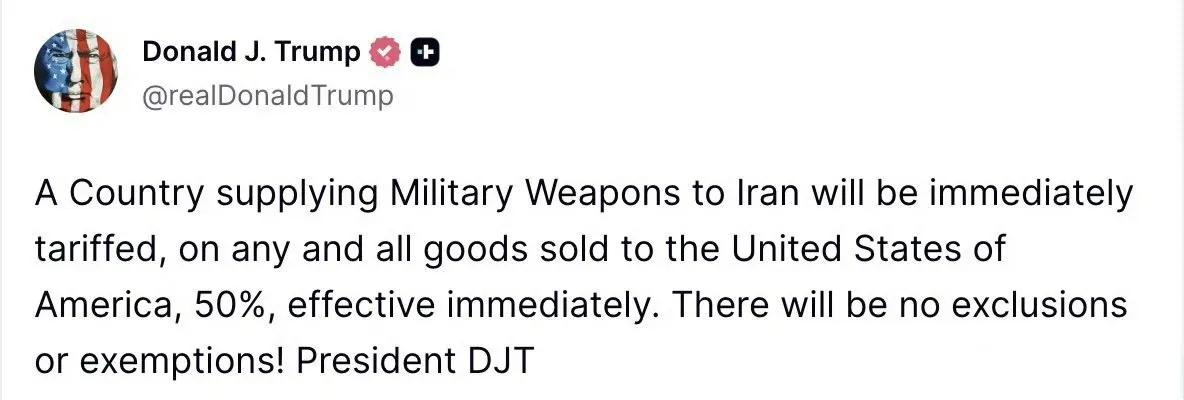 懂王在“真实社交”上发帖称:任何向伊朗供应军事武器的国家,其销往美国的所有商品将被立即征收50%的关税,立即生效。将没有任何例外或豁免!