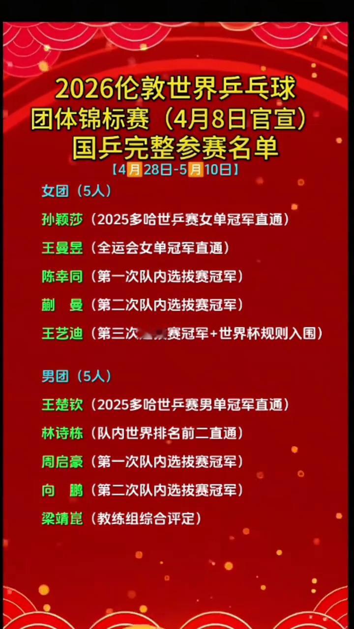 2026伦敦世界乒乓球团体锦标赛(4月8日官宣)国乒完整参赛名单。 4月28日-