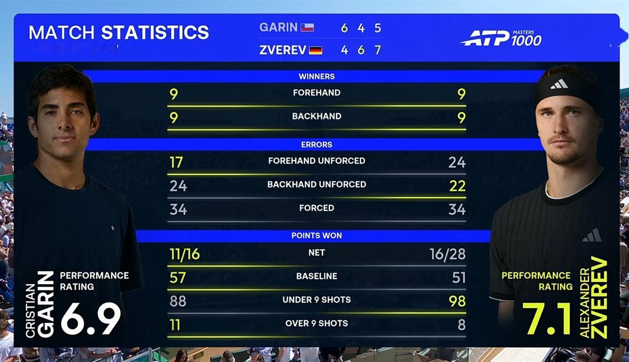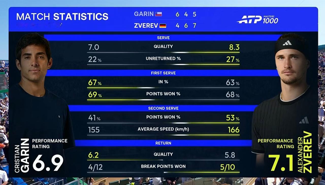 第一盘,前九局各自保发。第十局,兹维列夫非保不可发球局,加林在对手握有连续两个局点的情况下追平比分并成功破发。