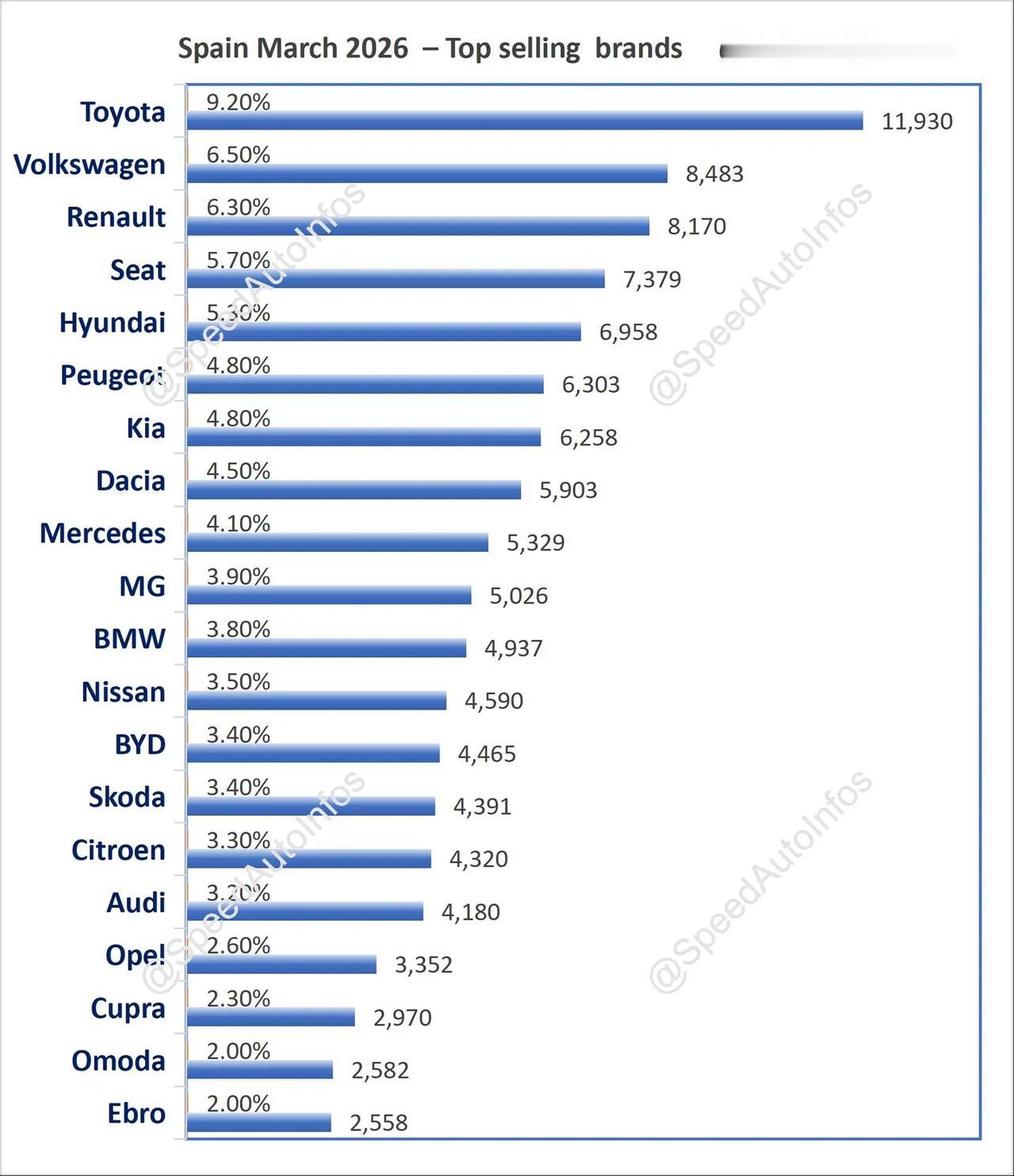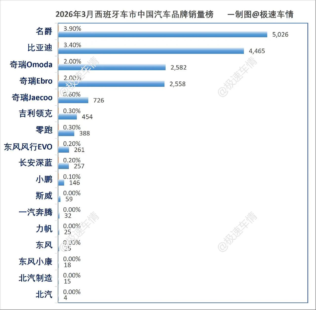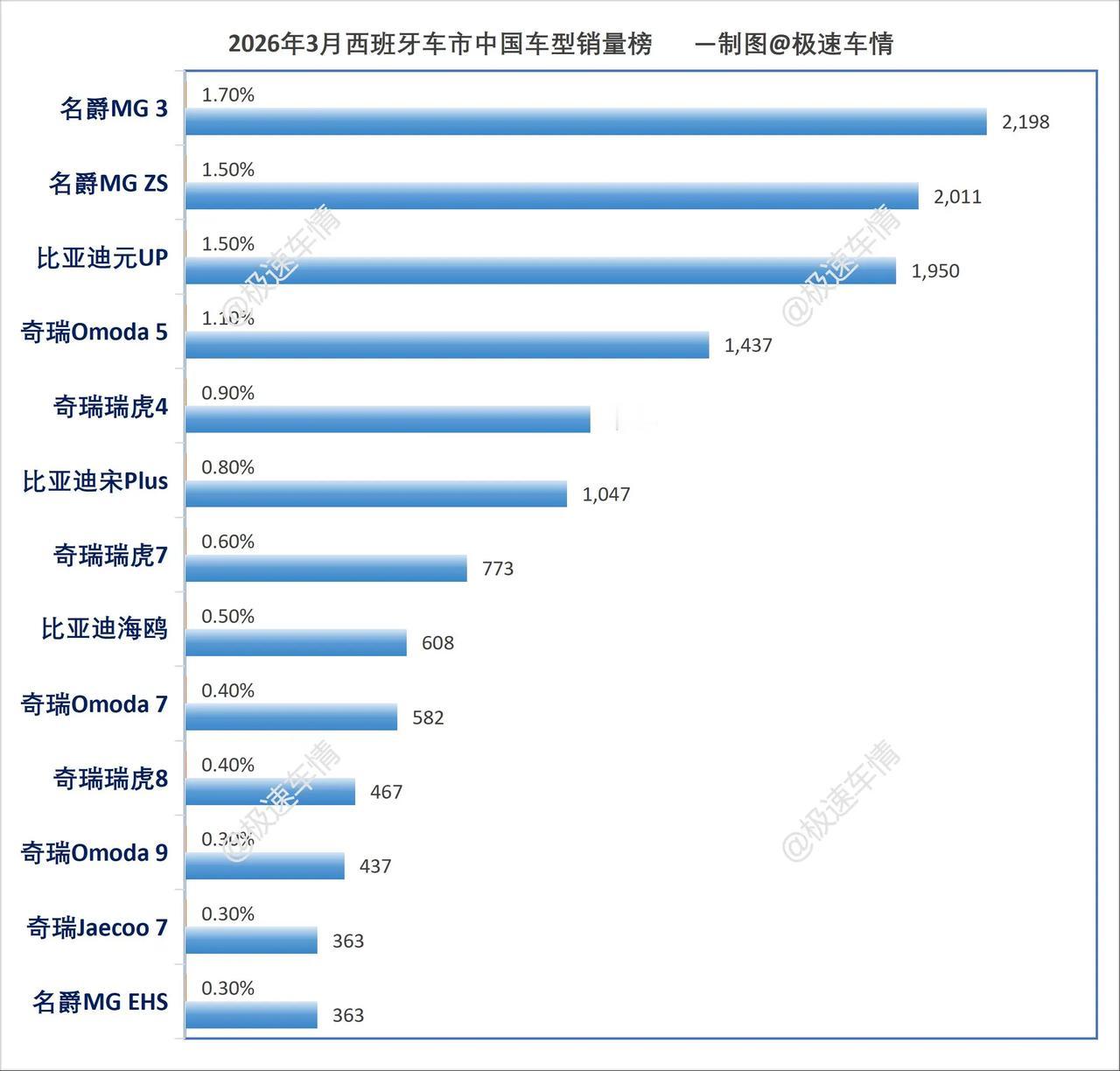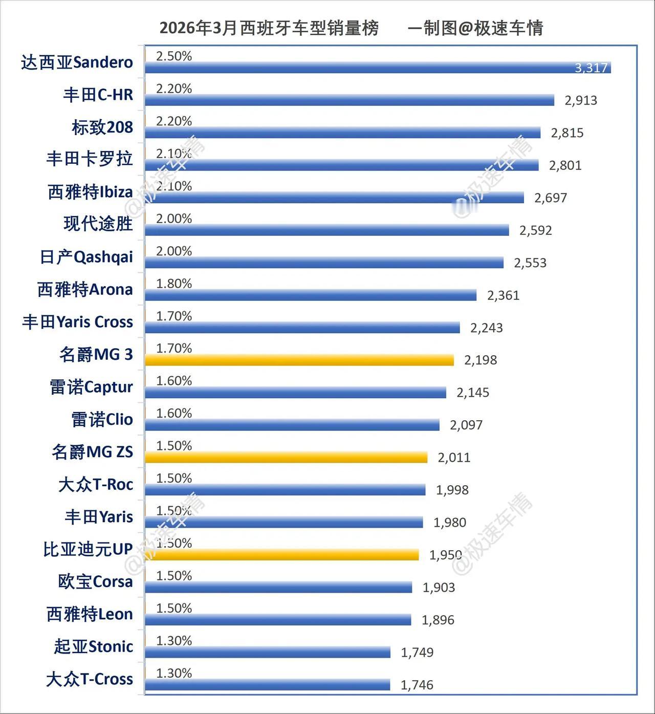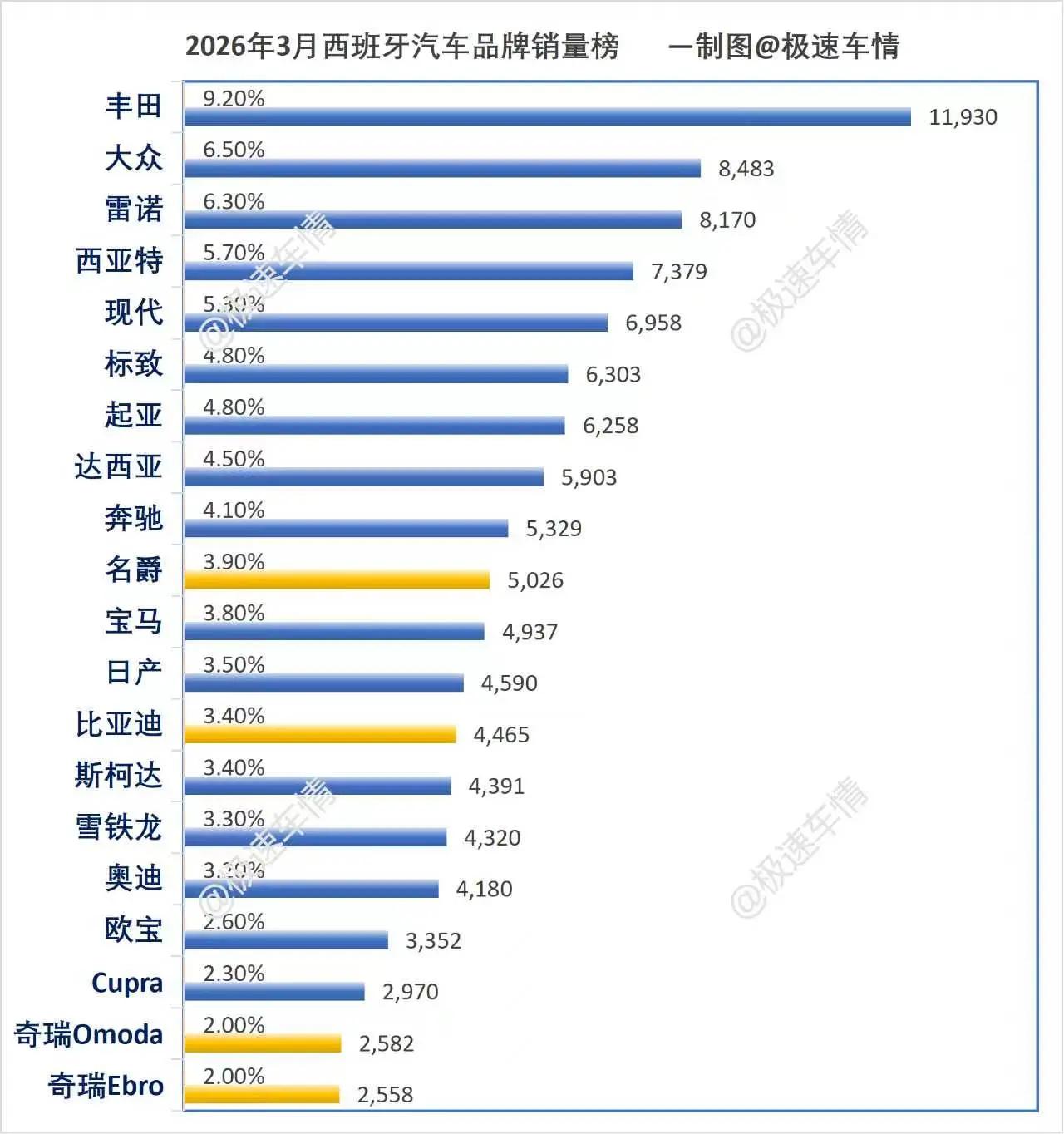 西班牙2026年3月汽车销量排行榜!西班牙3月,奇瑞Ebro暴涨359.2%、奇瑞Omoda暴涨258.6%、比亚迪暴涨174.6%,名爵居中企销量第一。极速车情 西班牙 比亚迪 奇瑞