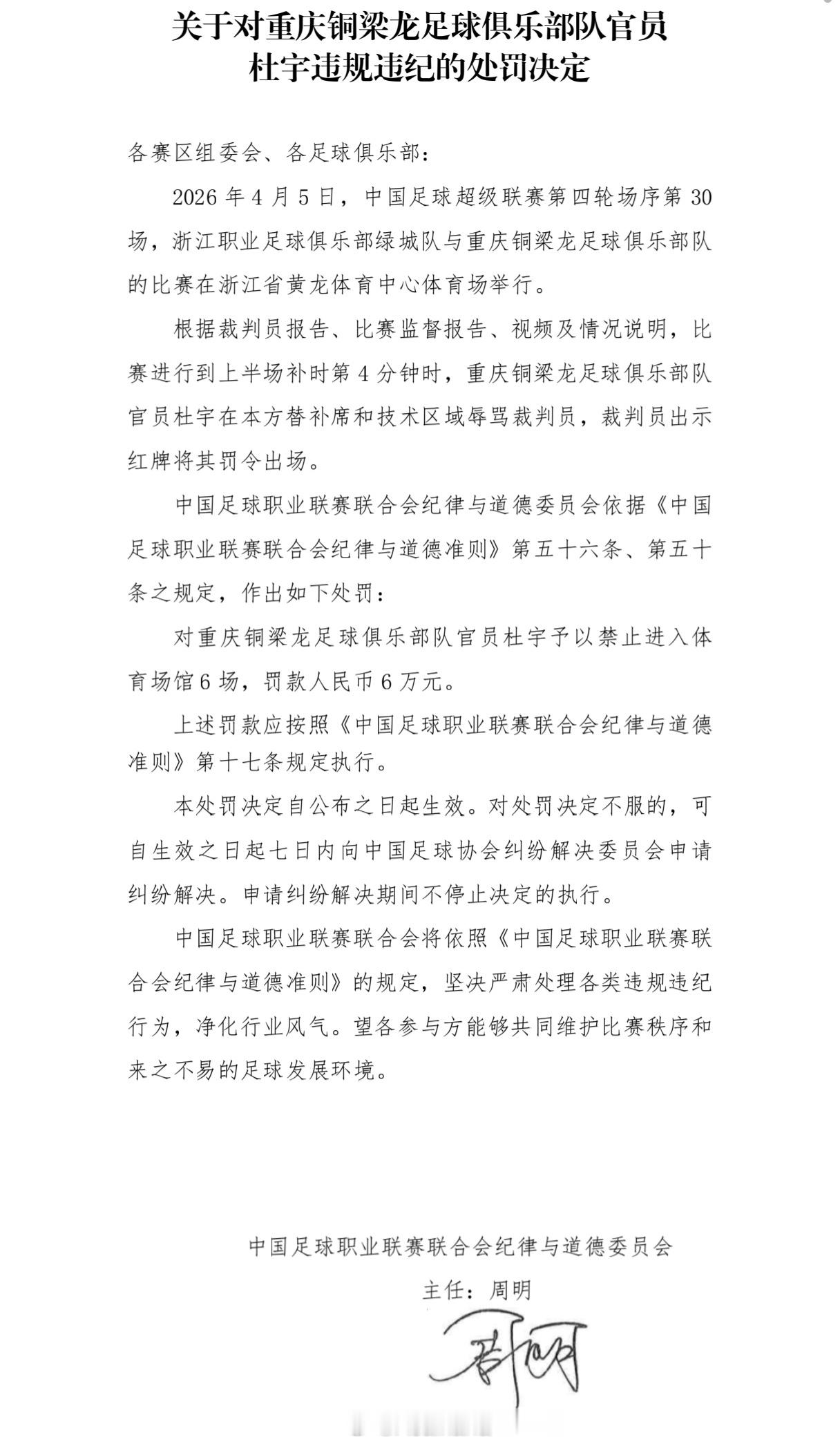 官方:浙江米特里策被停赛4场罚款4万。重庆铜梁龙助教杜宇被禁赛6场+罚款6万元!