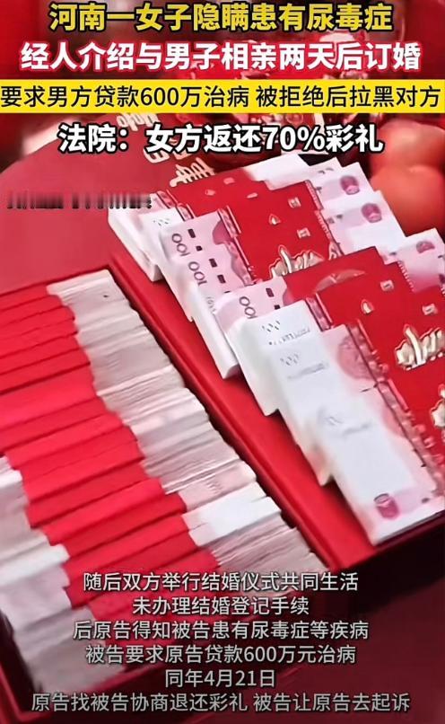 男子瞬间被浇了一盆冷水,大脑一片空白。238000元彩礼已经花光了他大半积蓄,600万的贷款更是天文数字,他根本无力承担。更让他气愤的是,女子刻意隐瞒重病,相当于骗着他结了婚,他没有义务为这份欺骗买单。