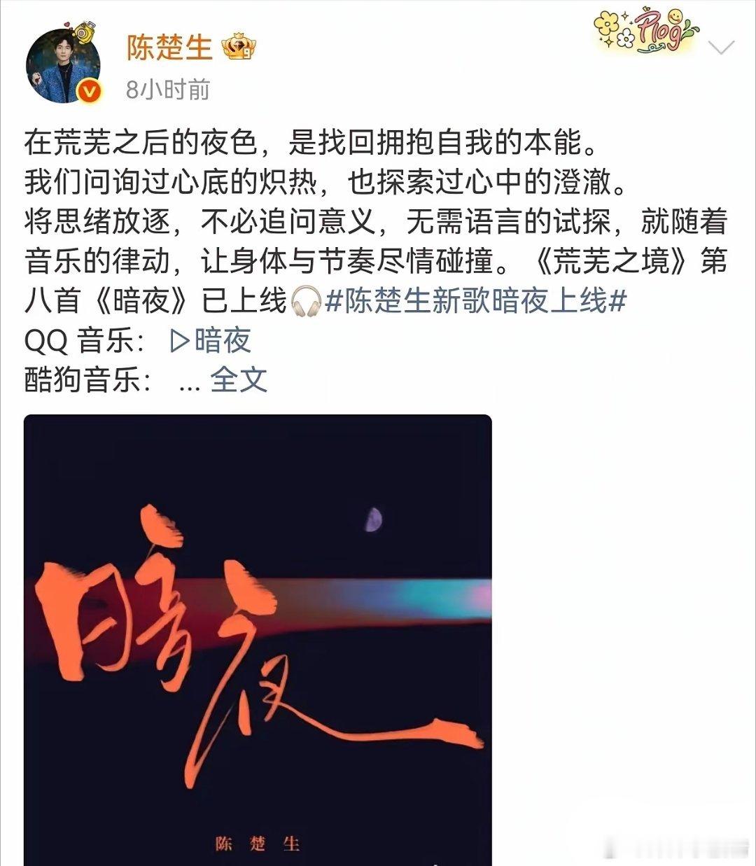 陈楚生,高调发文!4月8日凌晨,歌手陈楚生,突然在社交平台高调发文,让人没想到的是,这次他官宣的一首新歌,作词、作曲、编曲、制作人都是他本人。歌曲名字《暗夜》很容易让人联想到陈楚生一路走过来的不易。早年在深圳酒吧驻唱,每晚跑两三场、月薪几千,屡遭拒绝仍不放弃。2003年拿下全国PUB歌手大赛冠军,2007年《快乐男声》全国总冠军,《有没有人告诉你》火遍全国 。经历解约风波、风格转型,他始终稳扎稳打 。如今的他,早已不是当年的民谣小生。2023年《披荆斩棘3》总冠军、2024年微博年度实力歌手、2025年《歌手2025》歌王、腾讯音乐榜年度音乐人 。7张个人专辑、80多首原创、20余首影视OST,拿遍东方风云榜最佳男歌手、华鼎奖最佳原创歌手等权威奖项。《荒芜之境》多首单曲登榜,口碑与热度双丰收 。从底层驻唱到顶流歌王,从被标签束缚到全面掌控创作,陈楚生用23年证明:真正的音乐人,不靠流量炒作,只靠作品与坚持说话。 低谷不垮、巅峰不飘,始终专注音乐本身,这才是穿越岁月、打动人心的永恒力量。