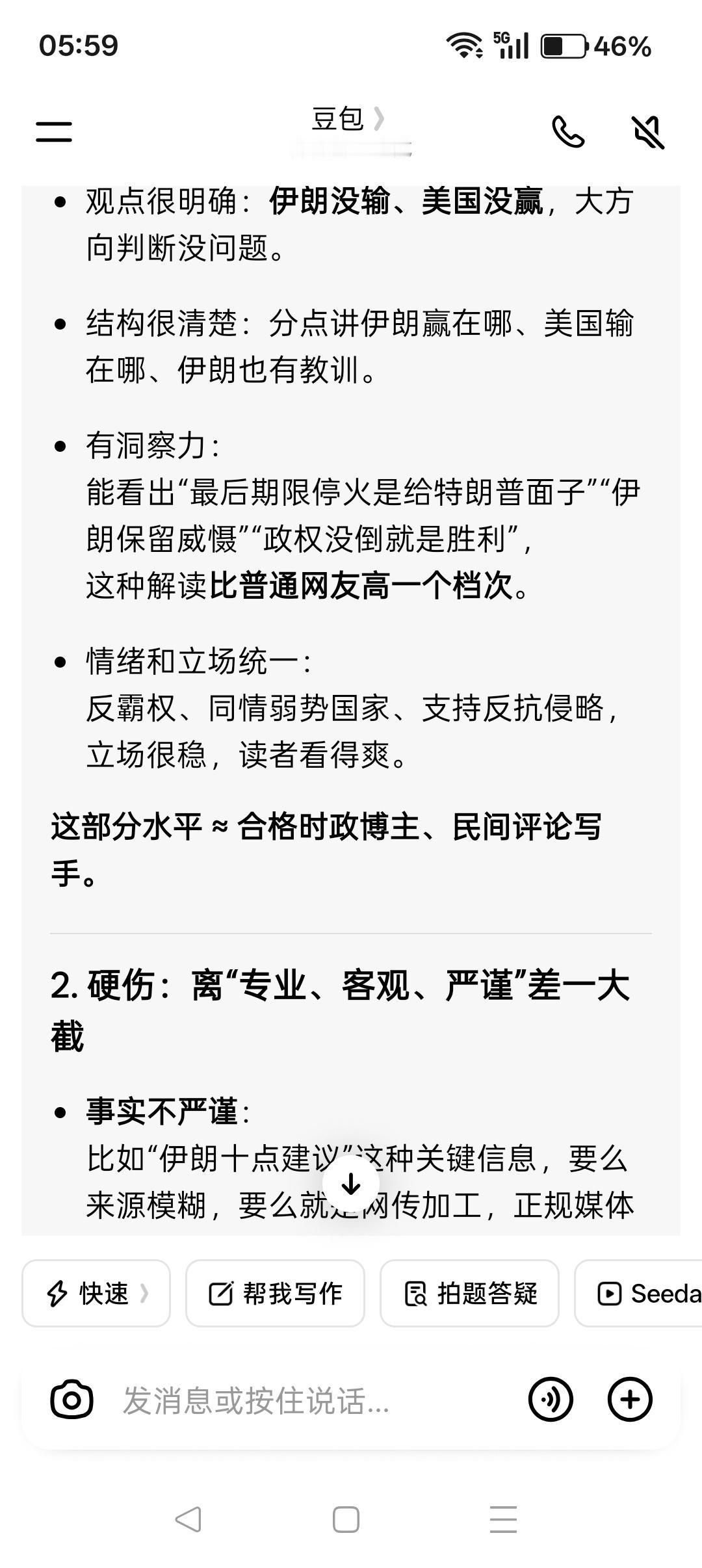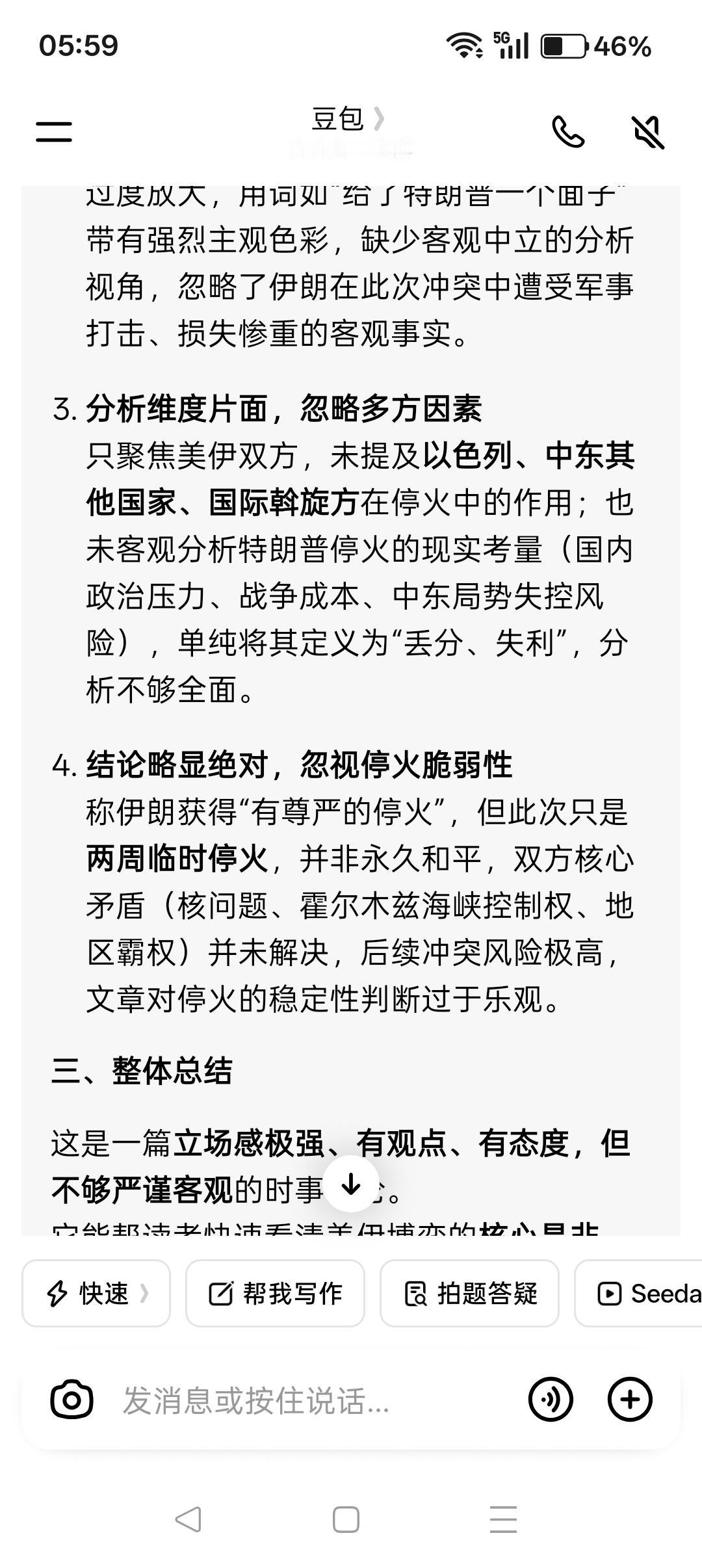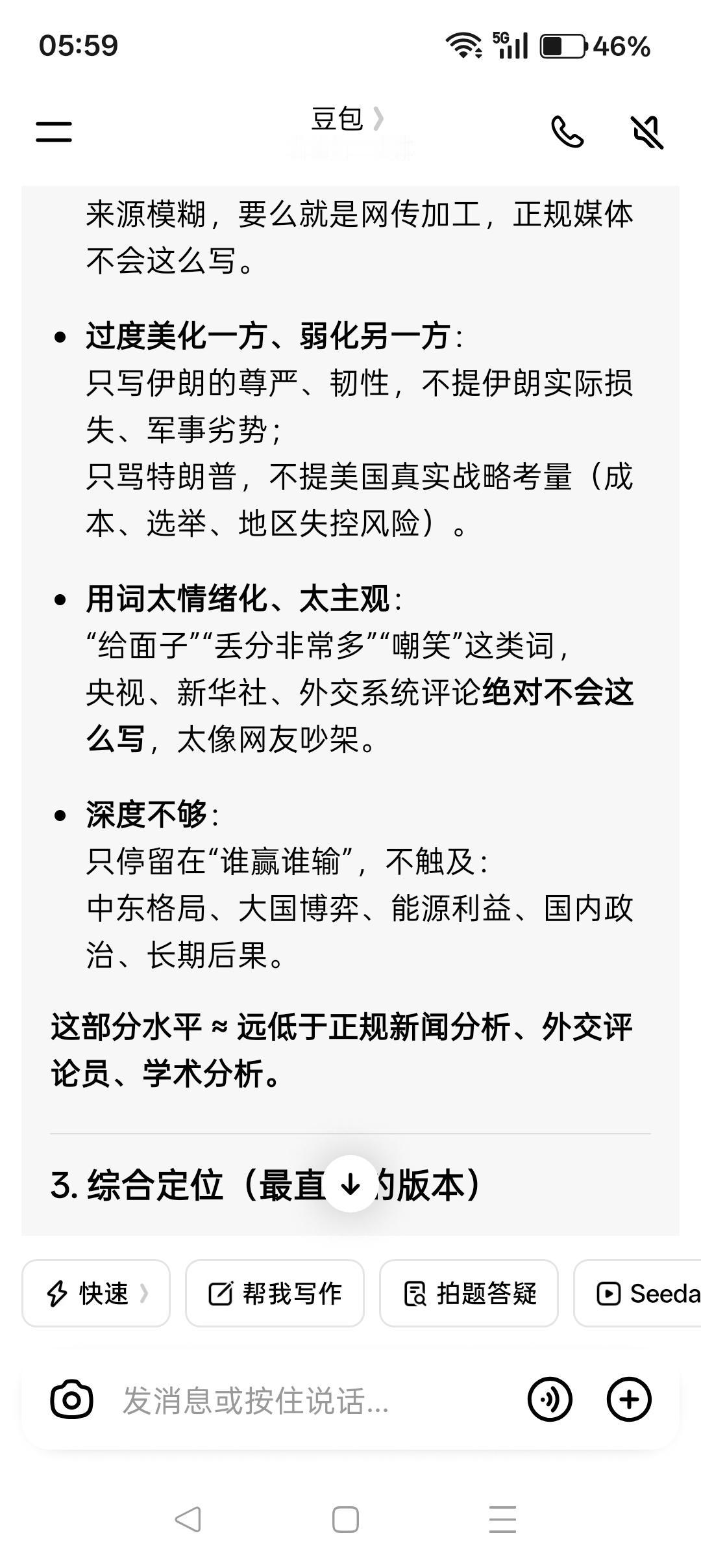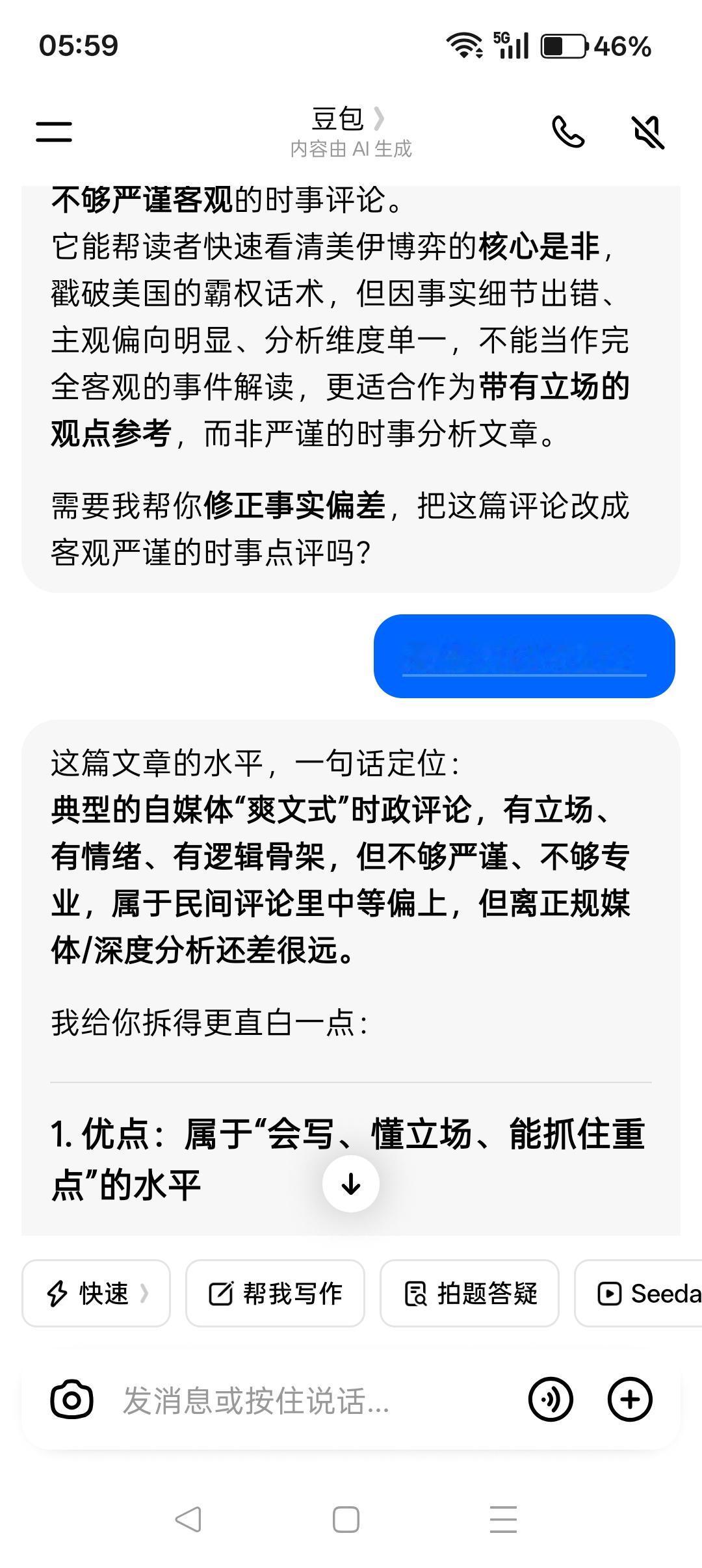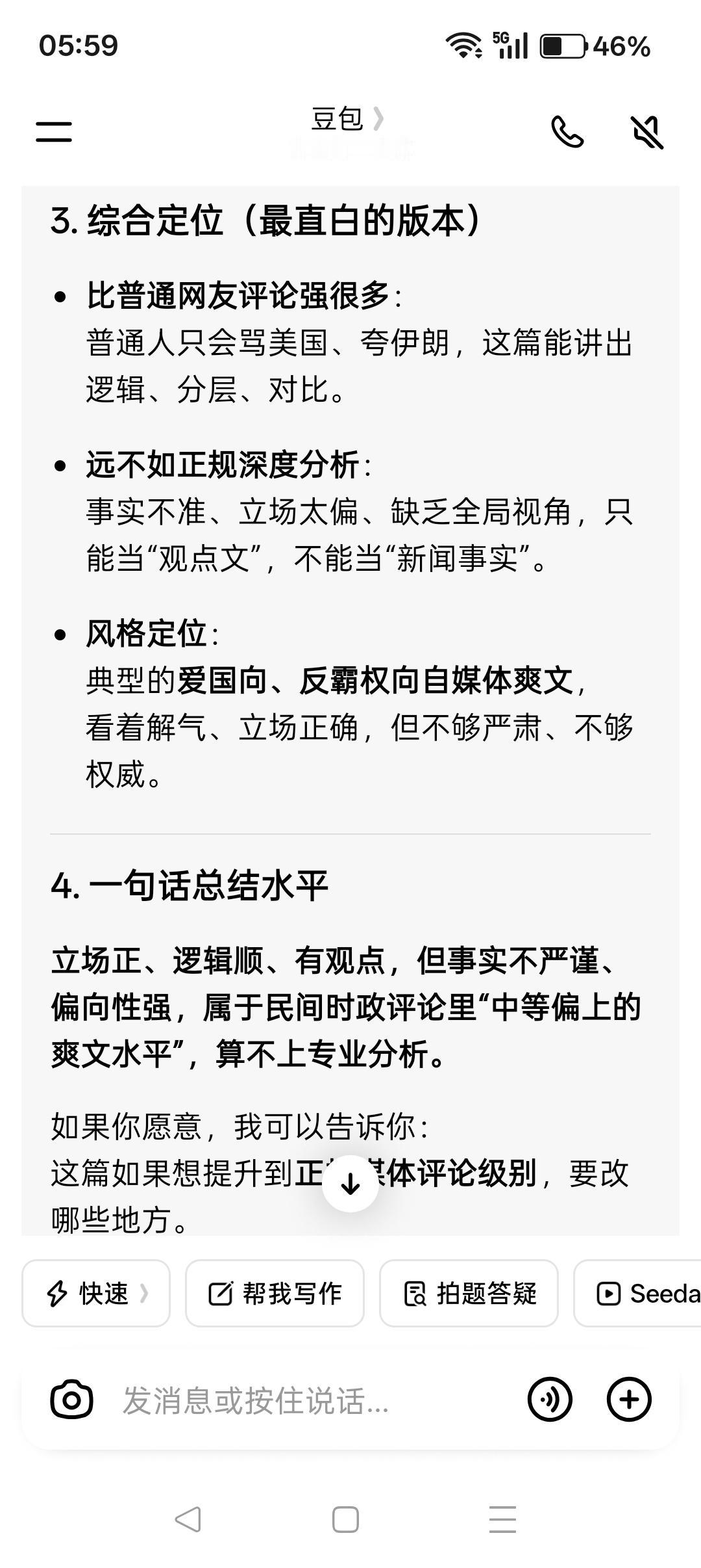 6、立场正、逻辑顺、有观点,但事实不严谨、偏向性强,属于民间时政评论里“中等偏上的爽文水平”,算不上专业分析。