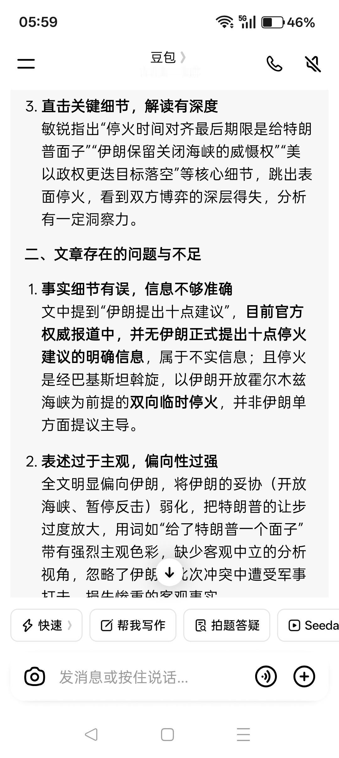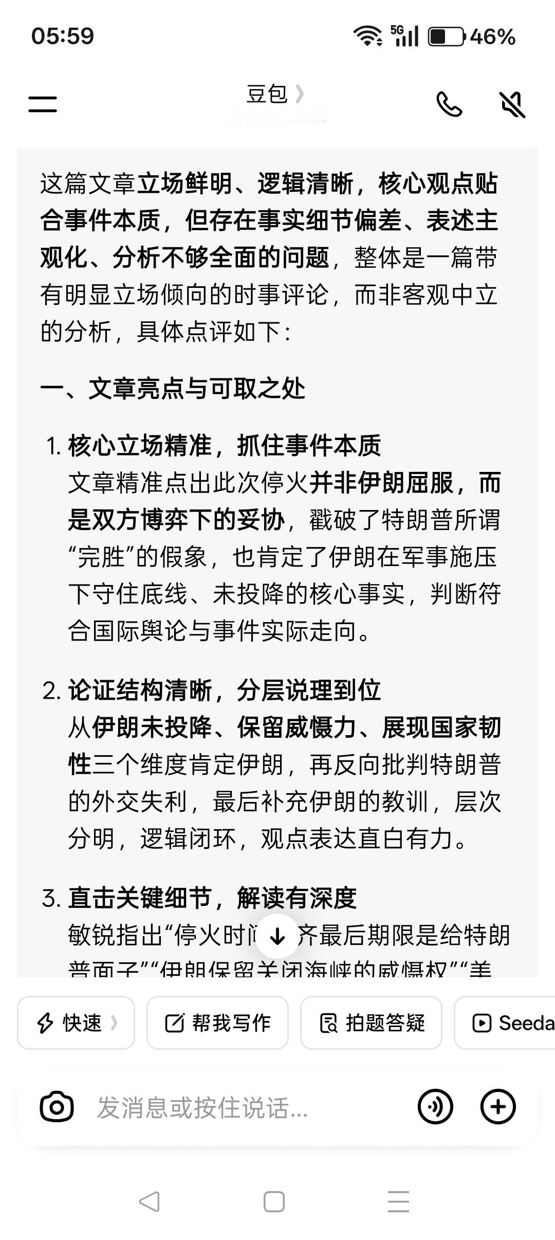 用豆包点评胡锡进的文章,评语很搞笑! 豆包分别点明了这篇文章的优点和缺点,在此
