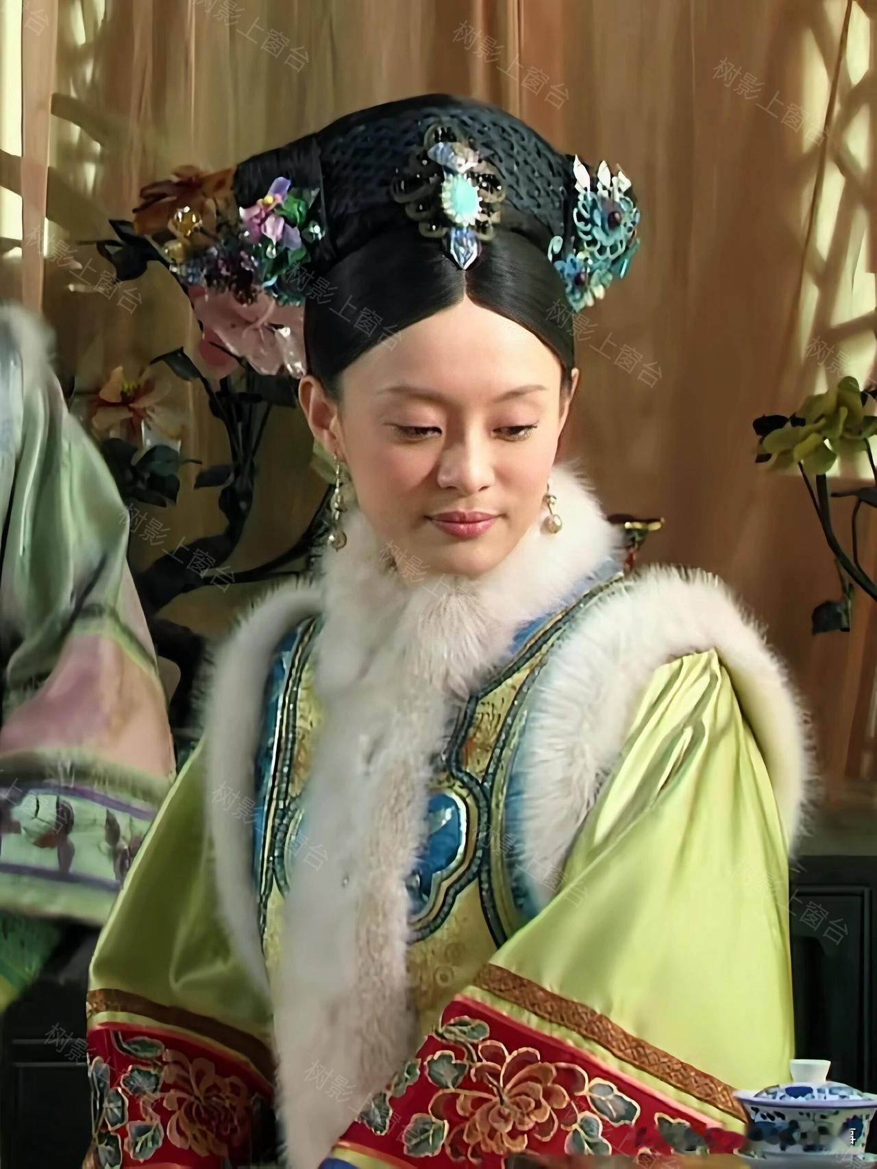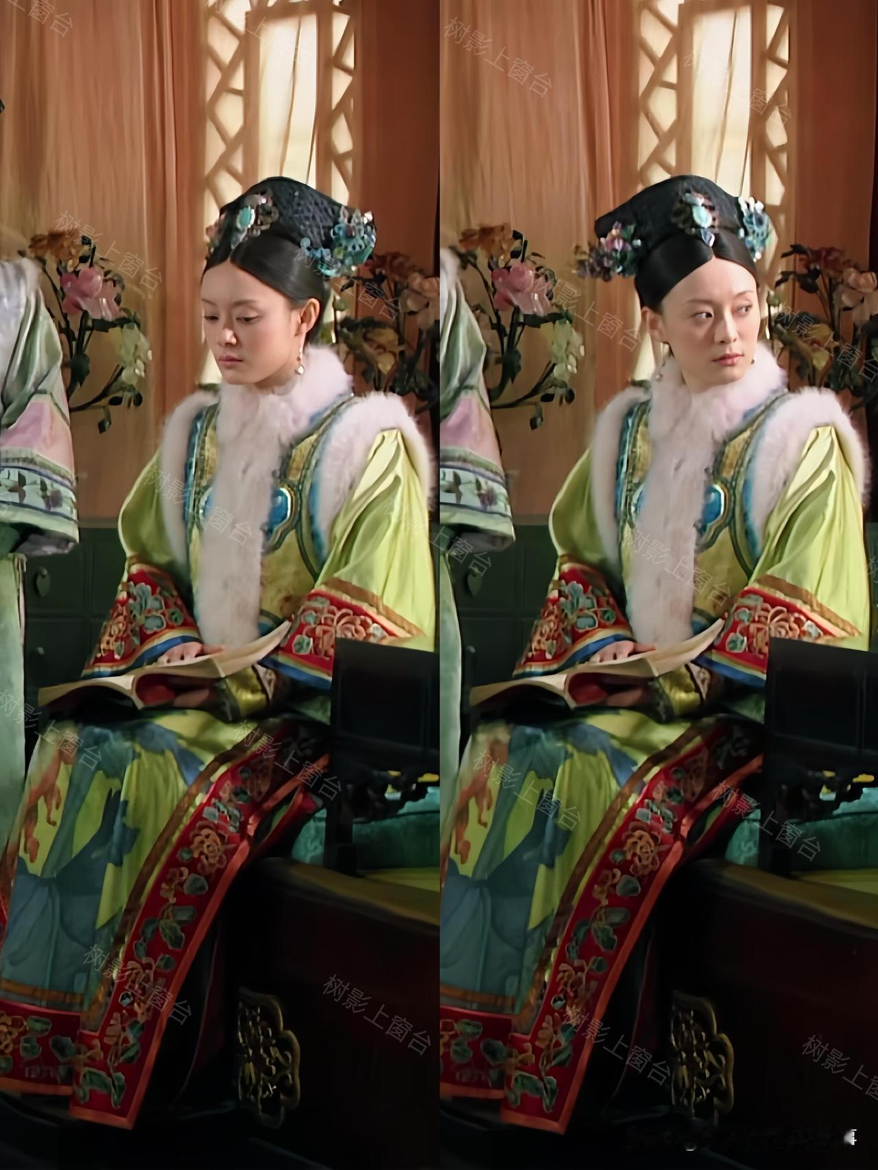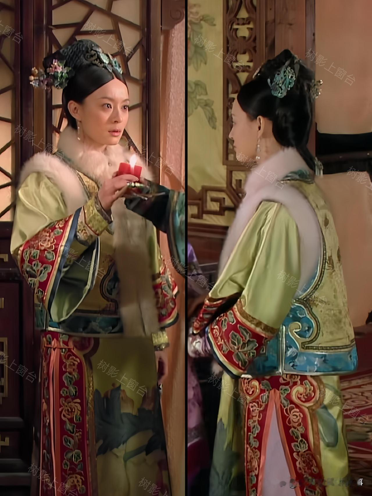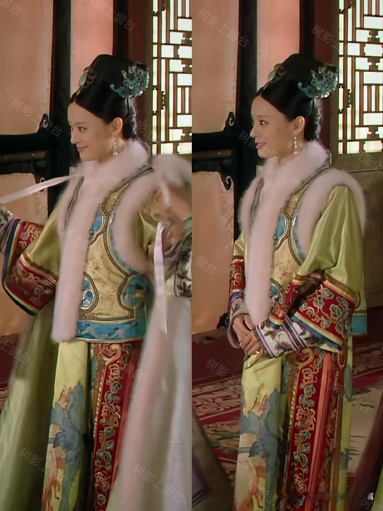 单看这身配色就很有讲究——清新的绿底透着淡淡的明黄光泽,袖口是明艳的红色花纹,搭配白狐毛领,华贵感直接拉满,妥妥的宠妃排面。可偏偏这套衣服的规制,贵于嫔、低于妃的贵嫔仪制,妥妥越级了。