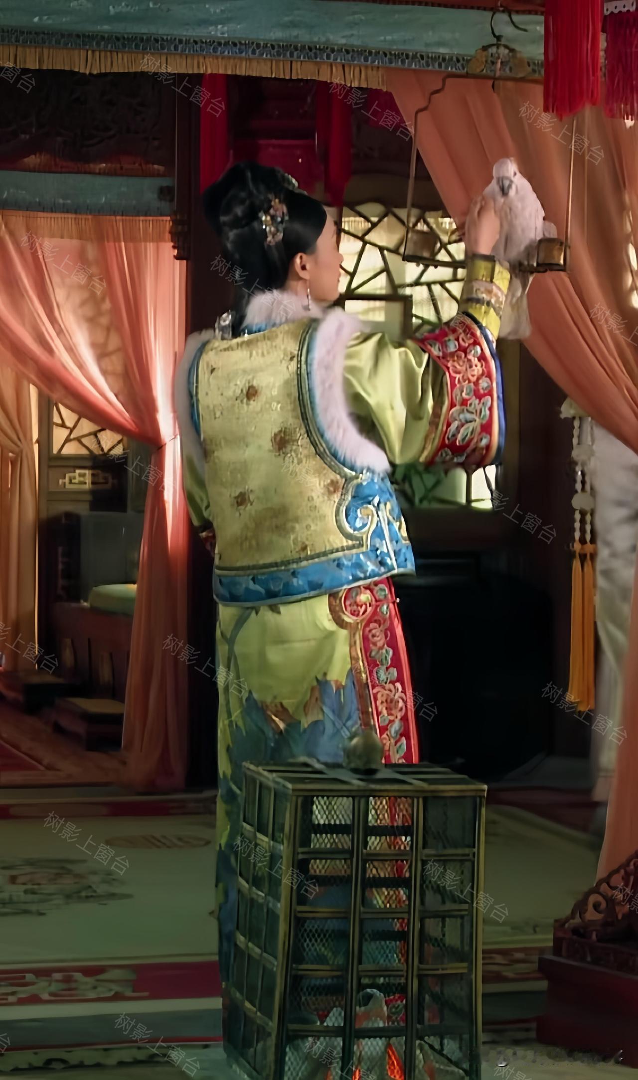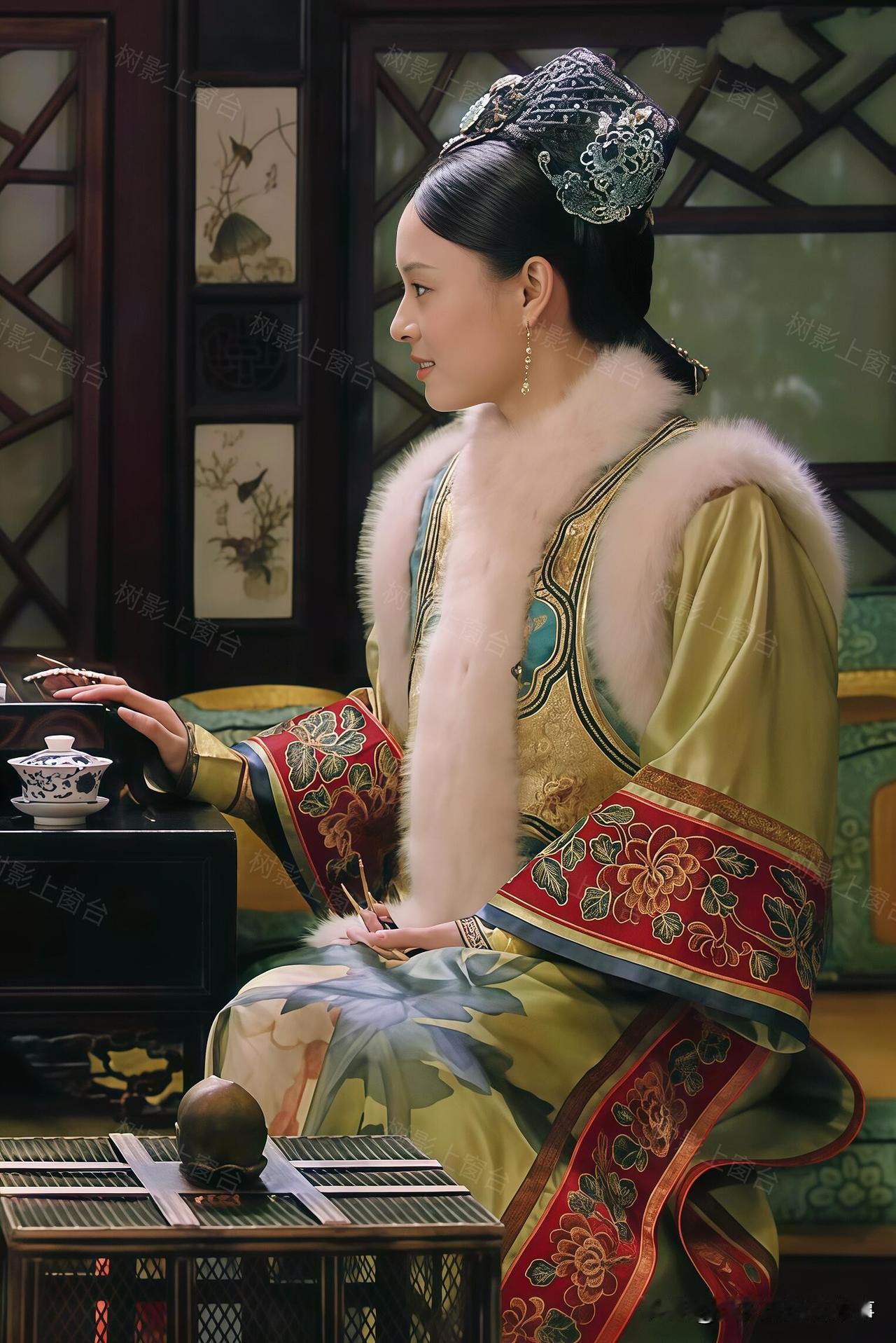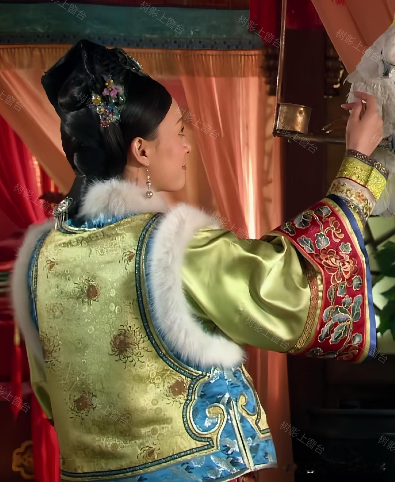 单看这身配色就很有讲究——清新的绿底透着淡淡的明黄光泽,袖口是明艳的红色花纹,搭配白狐毛领,华贵感直接拉满,妥妥的宠妃排面。可偏偏这套衣服的规制,贵于嫔、低于妃的贵嫔仪制,妥妥越级了。