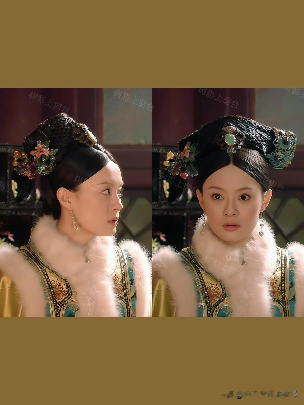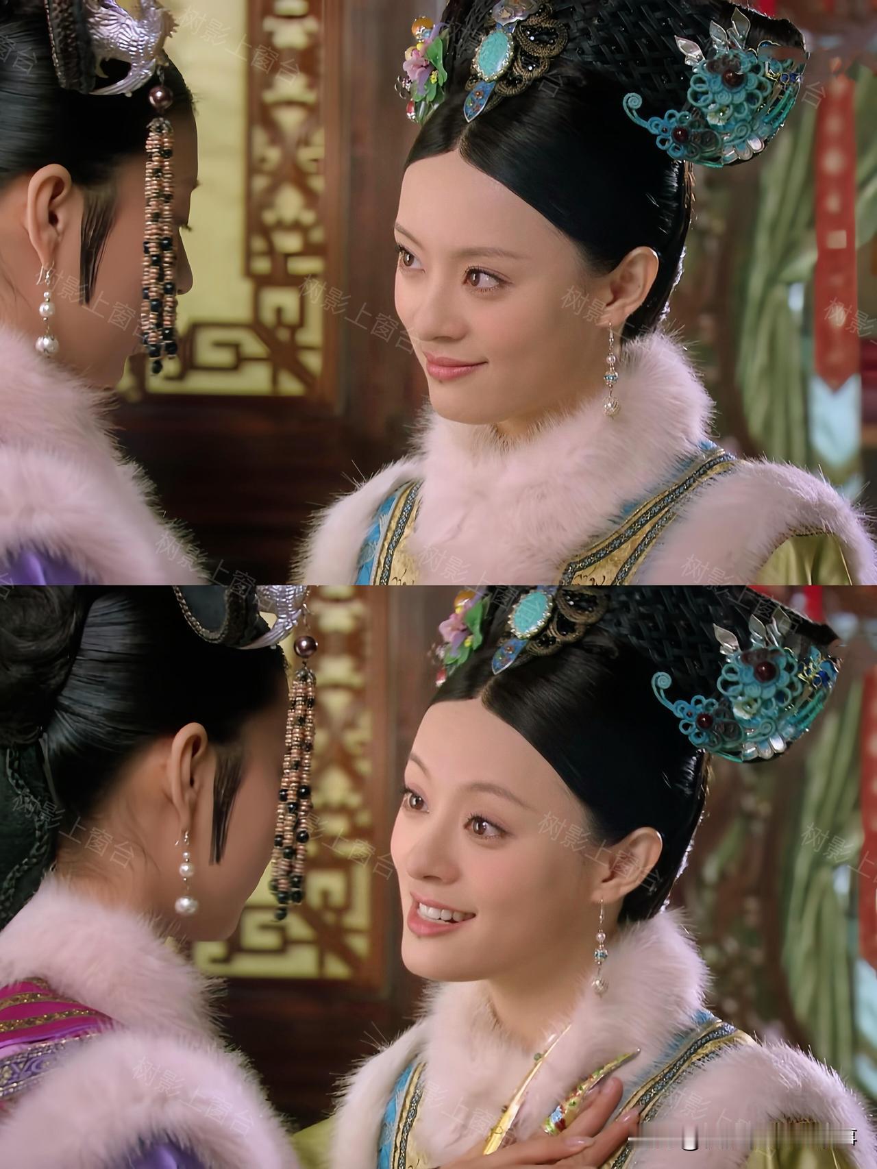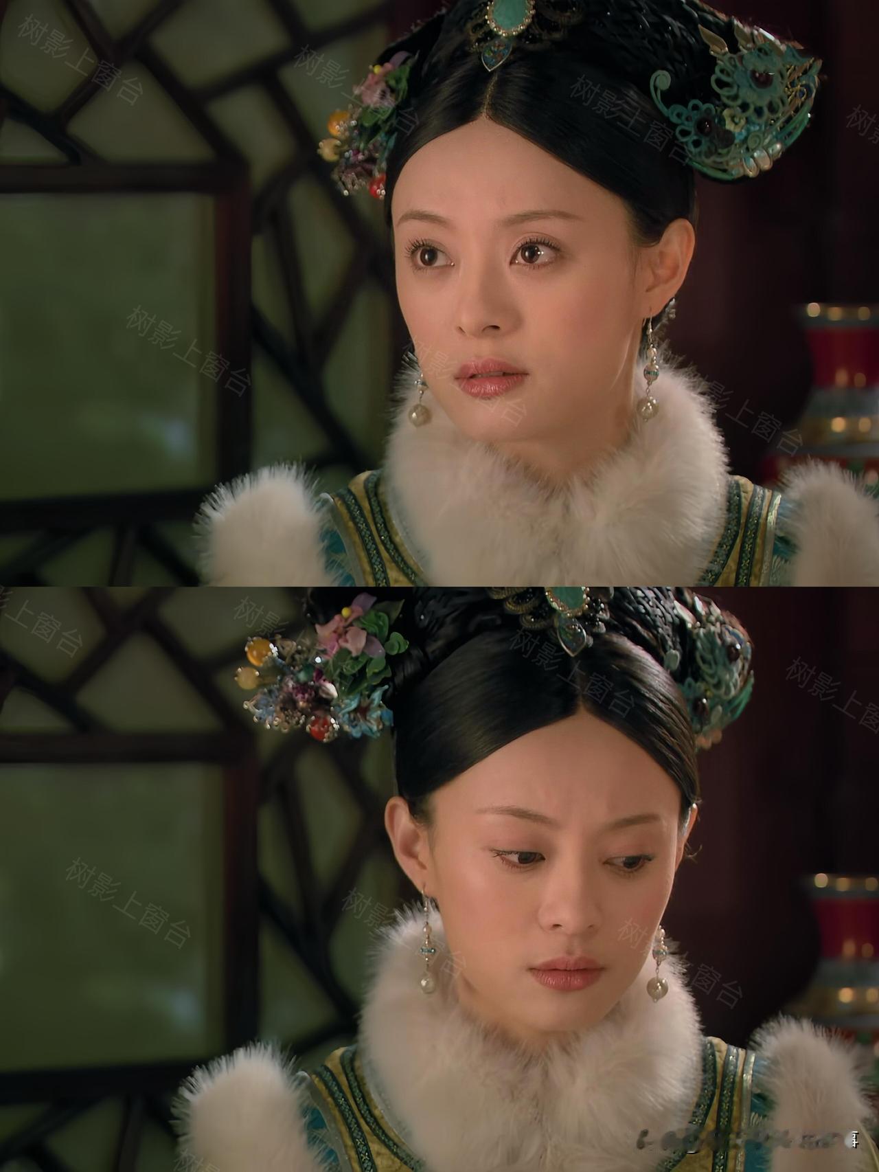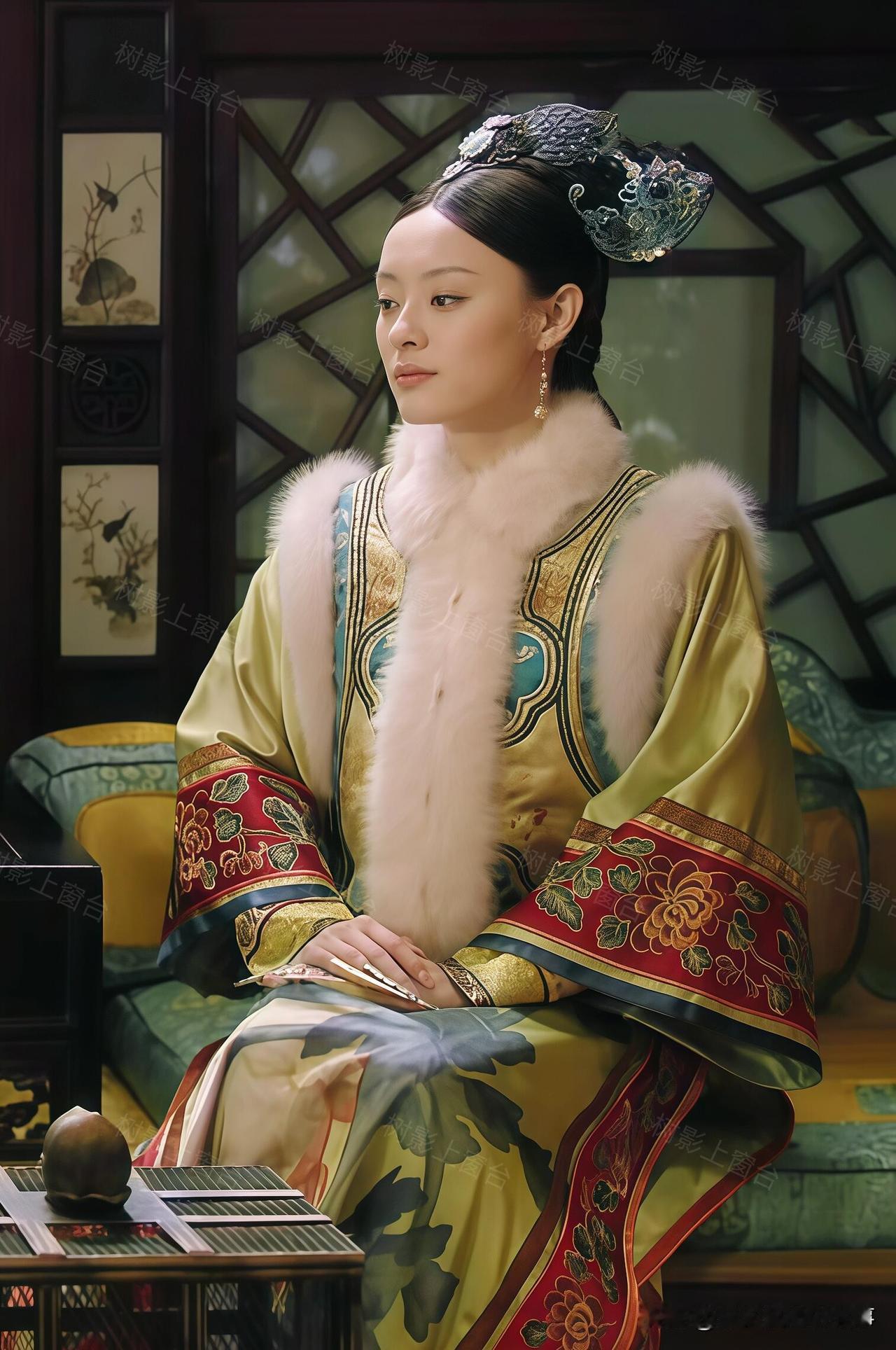 单看这身配色就很有讲究——清新的绿底透着淡淡的明黄光泽,袖口是明艳的红色花纹,搭配白狐毛领,华贵感直接拉满,妥妥的宠妃排面。可偏偏这套衣服的规制,贵于嫔、低于妃的贵嫔仪制,妥妥越级了。