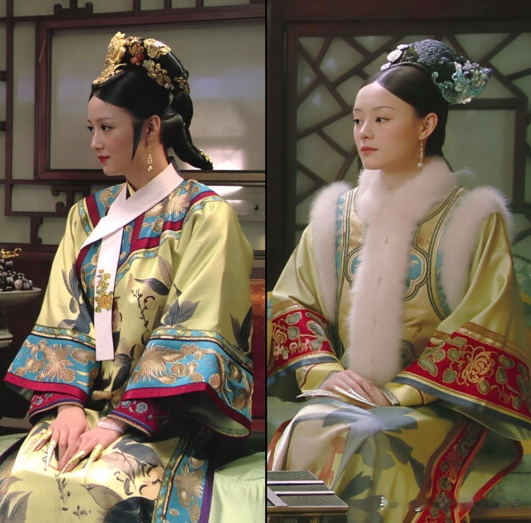 眉姐姐也有一套同形制的,同样好看,可惜就这一次亮相;华妃也有类似款,也印证了这套衣服的越级感。而且这套衣服真的只穿了两次——和眉姐姐和好、火烧碎玉轩,不到十分钟就毁在大火里,后期再也没出现。以它的做工配色,就算给后期的熹妃、熹贵妃穿,也完全撑得起场面,真的太可惜了。