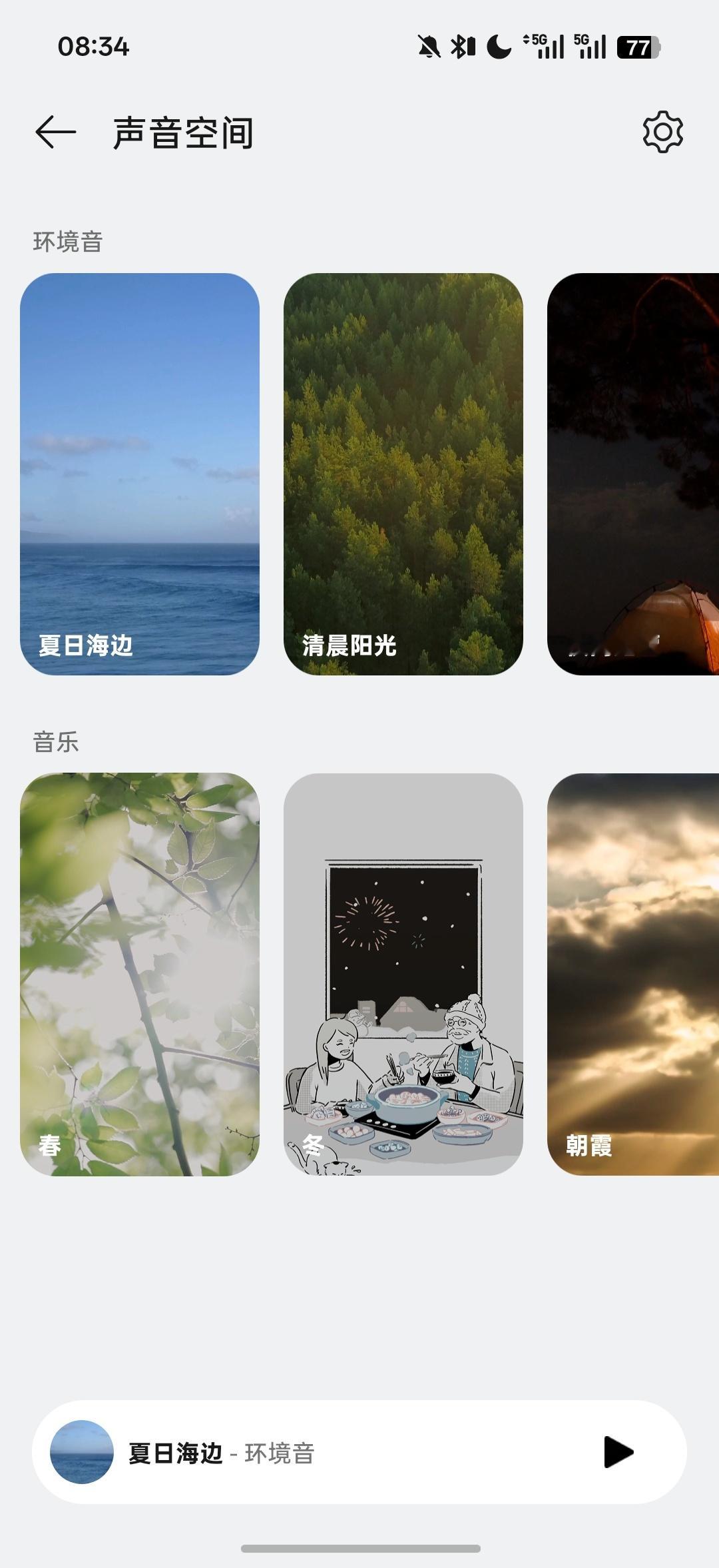 其他软件体验上,Enco Clip2 有一个自带的白噪音空间,可以播放一些有助于睡眠、学习的声音,这边截了一些 Live 动图(图10、图11、图12),大家可以稍微感受一下效果~