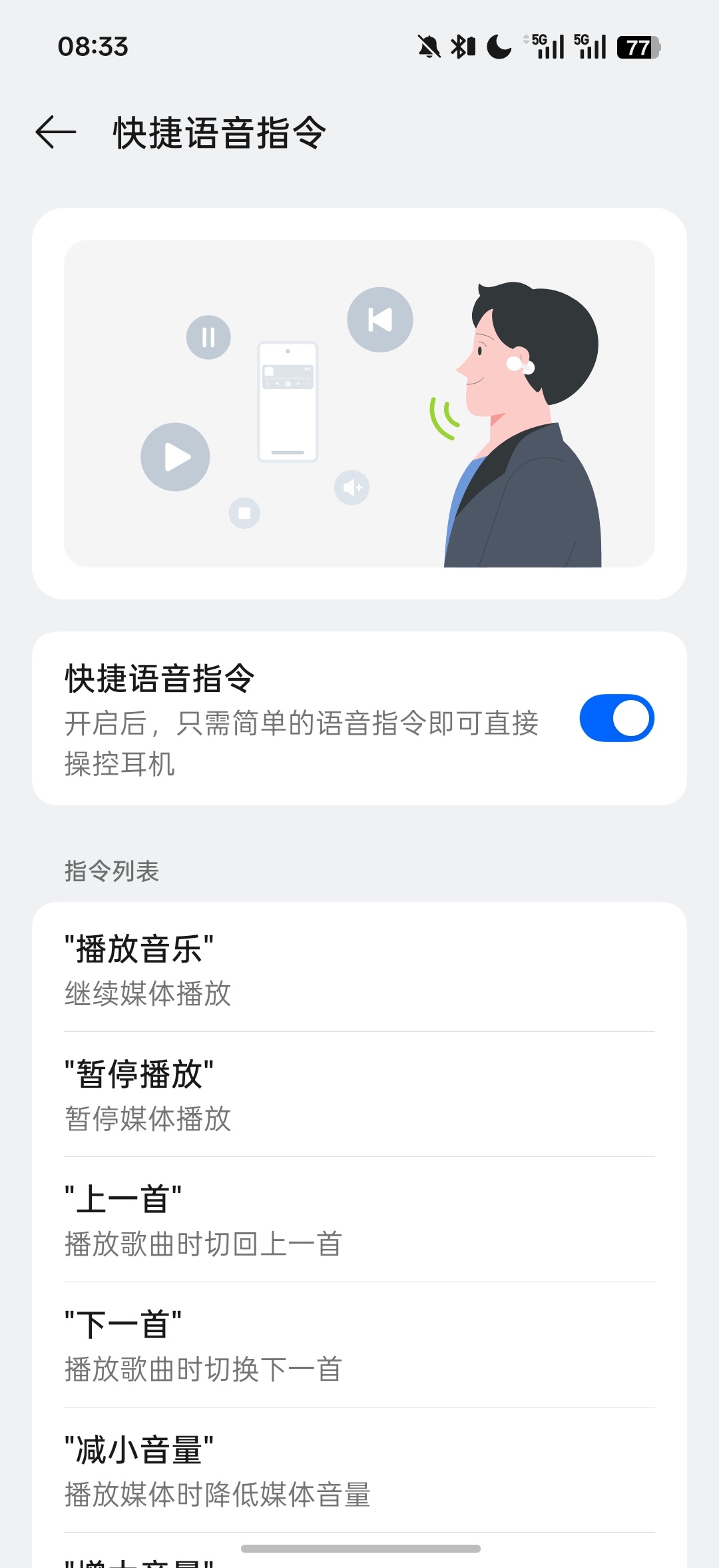 二是它新增了快捷语音指令功能,说出唤醒词就能快速触发切歌、调音量之类的操作;需要强调的是,这个功能不依赖手机的语音助手,完全靠耳机的算力,所以无论连接什么设备都可以使用。