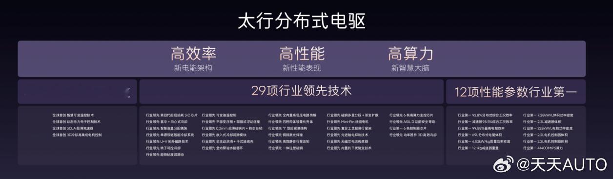 太行分布式电驱集4项全球首创黑科技,12项行业第一参数,29项行业领先的技术于一身,拥有高效率、高性能、高算力三大核心优势。电驱系统工况效率超92.8%,全球第一,功率大幅提升的同时续航几乎零折损;体积功率密度行业第一,以更小体积释放更强马力,新阿维塔12三电机四驱版0-100km/h加速仅2.71秒,媲美500万级超跑;算力方面搭载全球最高六核电机控制器芯片,每秒处理40亿条指令,带来闪电般的扭矩响应和精细入微的控制,通过对左右两个电机进行超精密的独立控制,提供超过传统机械四驱100倍的扭矩响应速度。此外,新阿维塔12还搭载了法拉利同款电磁避震,支持全段阻尼无级调整,每秒千次的调整能力,紧急场景下快速抑制车身侧倾与俯仰,完美平衡日常舒适性与运动操控性。