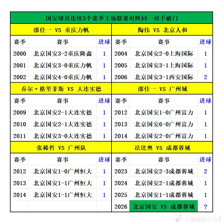 🥅【攻破过对方球门的球员】⚽北京国安队内(效力国安期间):法比奥4球;张玉宁、曹永竞、林良铭各1球。