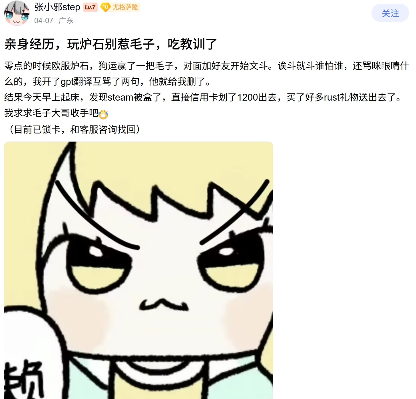 炉石传说 哈人!欧服炉石赢了毛子,加好友对骂,第二天steam被盒了,直接信用卡划了1200出去。
