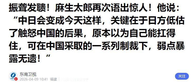 麻生太郎近日公开指出,中日会走到今天这一步,关键原因在于日本低估了触怒中国的后果,原本以为可以承受中国的反制措施,但在中国一系列精准制裁下,日本的经济和军事脆弱性暴露无遗。
