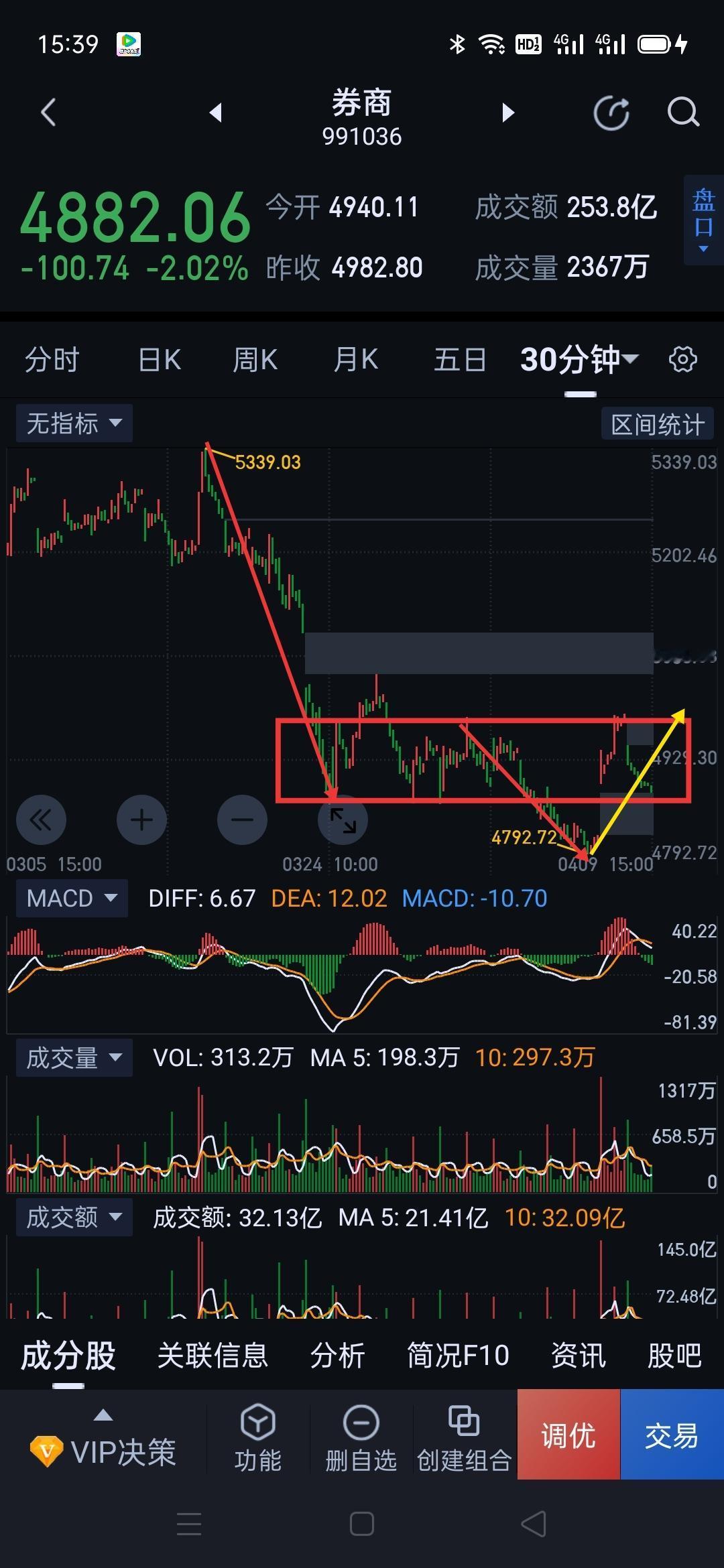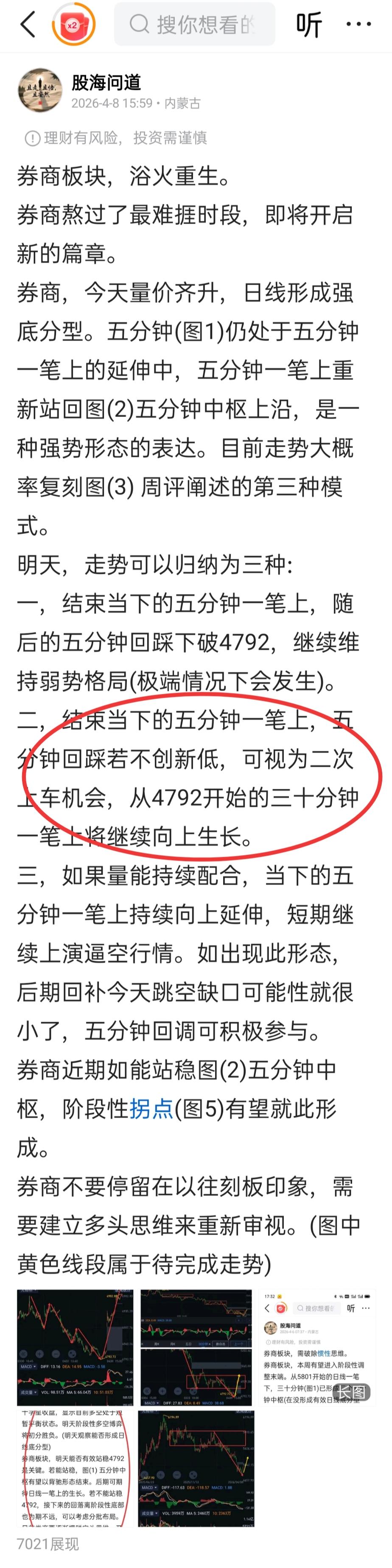 券商板块,暂无风险,正常的回踩确认。 券商今天缩量回调,早盘低开低走结束了昨天的五分钟一笔上。目前走势符合昨天所述(图1)第二种形态。今天如能找准节奏,很适合做"T"降低成本。 券商全天处于五分钟一笔下(图2)的回调中,截止收盘该五分钟一笔下还未呈现明显结束信号。 明天,券商在图(3)中枢下沿附近,多空应该会有适当争夺,只要该中枢不被有效破坏,仍可期待图(2)生长成五分钟级别的上涨结构(简单理解就是日线一笔上的生长)。 券商此处如果做“T”没把握,仍可以耐心持股待涨。目前的反弹(暂定义反弹)还没有结束迹象。(图中黄色线段属于待完成确认走势) 图(4)为日常操作的一部分。
