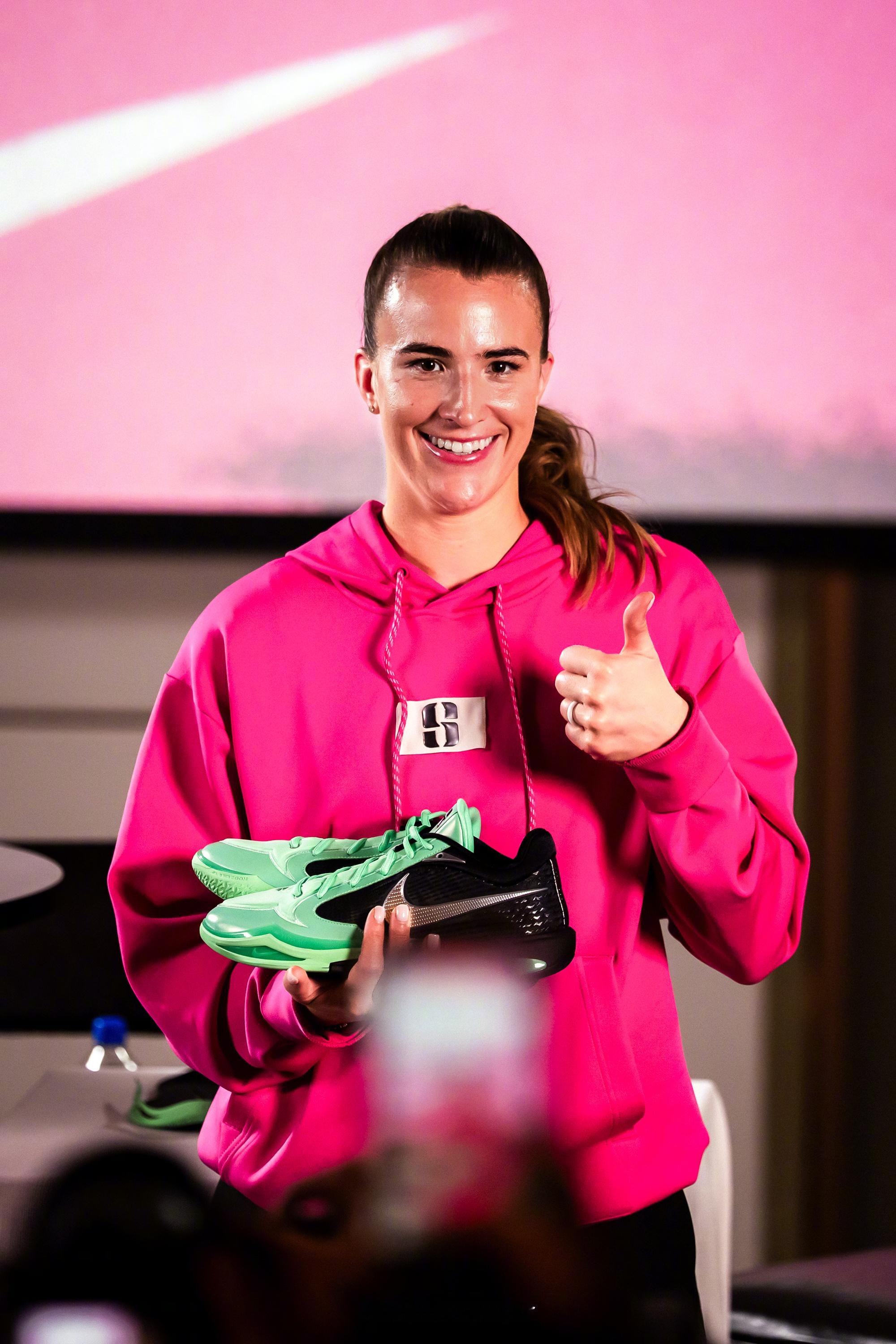 萨布丽娜Sabrina 4代签名鞋正式发布,鞋面和外底运用了大面积的「S」状纹路,中底在延续全掌Cushlon 3.0泡棉+前掌Zoom Air气垫的基础上,加入了全掌的FLYPLATE飞行板来提升整体的稳定性与助推性能,鞋舌、后跟和内侧的SWOOSH都可以看到Sabrina系列延续的设计细节。