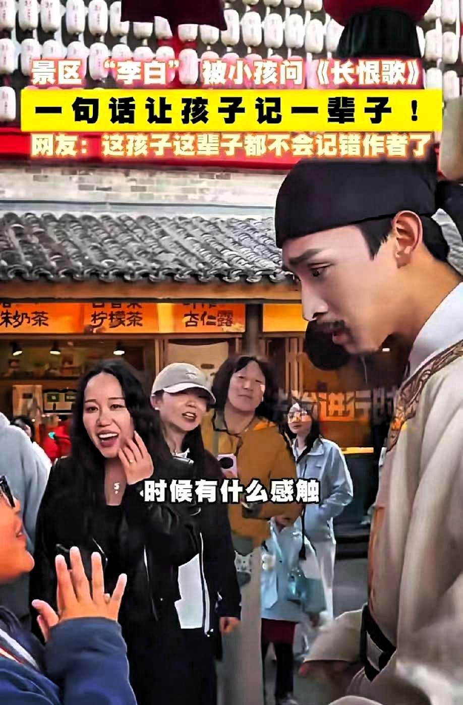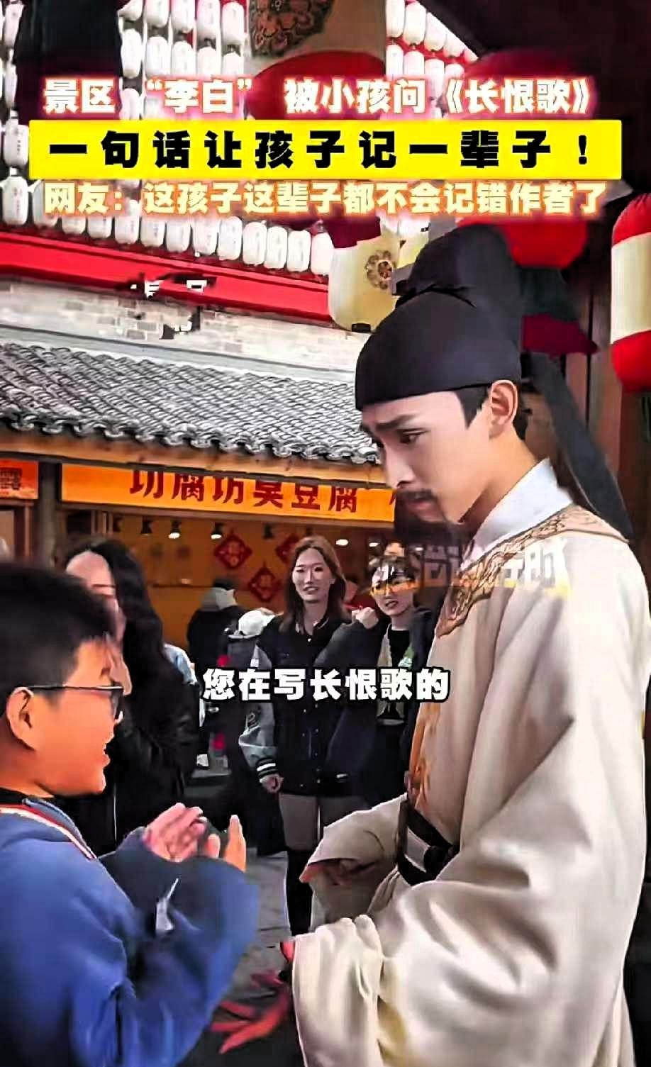 笑不活了!河北一小男孩在景区内遇到了一个男子扮演李白,十分好奇地走上前,认真询问对方写《长恨歌》时是什么感受。面对这个可爱的误会,扮演者并没有敷衍,而是温和又清晰地告诉孩子,《长恨歌》其实是白居易的作品。