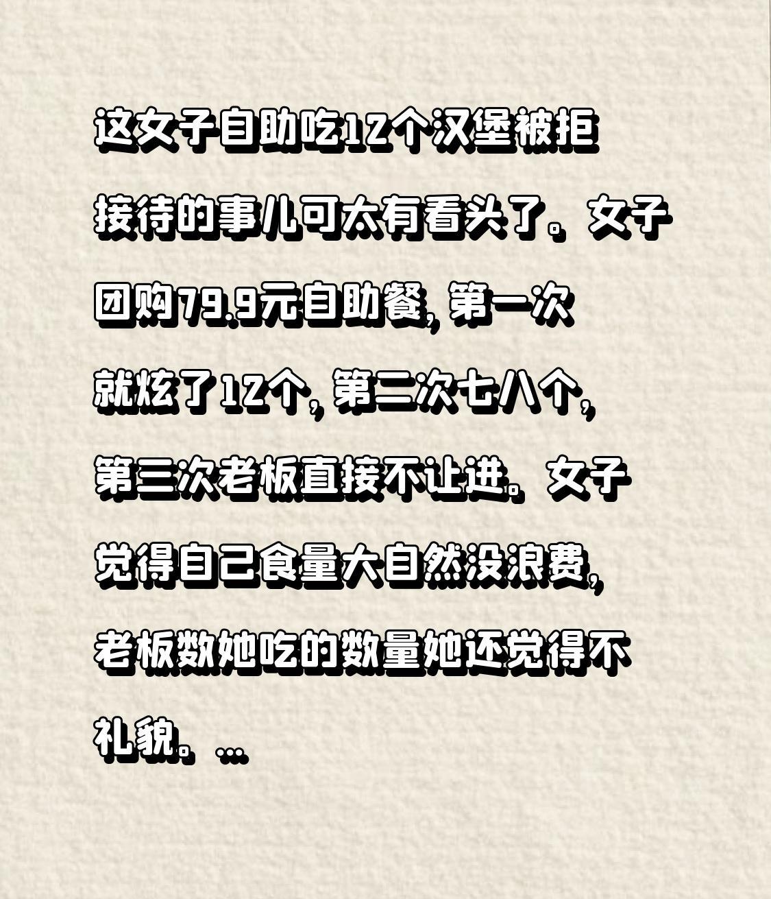 这女子自助吃12个汉堡被拒接待的事儿可太有看头了。女子团购79.9元自助餐,第一