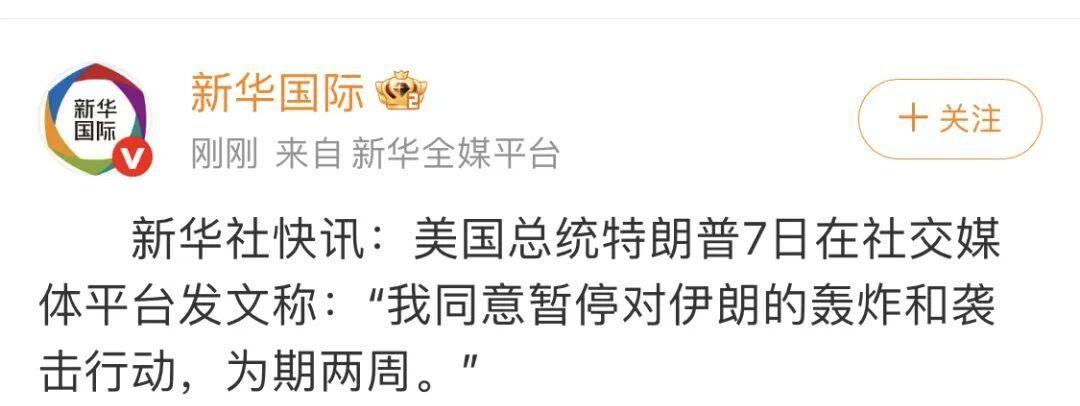 特朗普突然改口:“我同意暂停轰炸两周”,前提是伊朗开放霍尔木兹海峡,而伊朗也随即宣布接受巴基斯坦提出的停火建议。