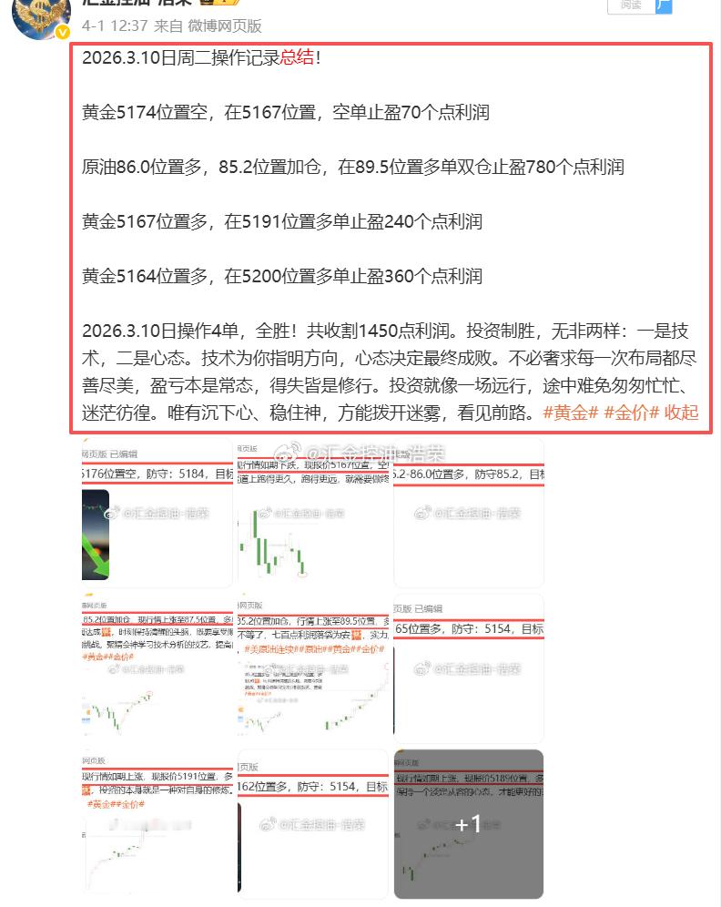 2026.3.10日周二操作4单,全胜,共斩获1450个点利润网页链接