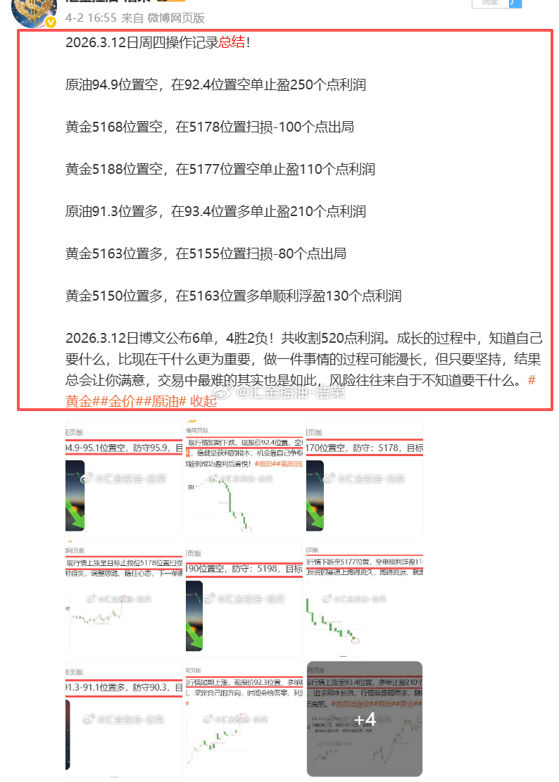 2026.3.12日周四操作6单,4胜2负,共收割520点利润网页链接