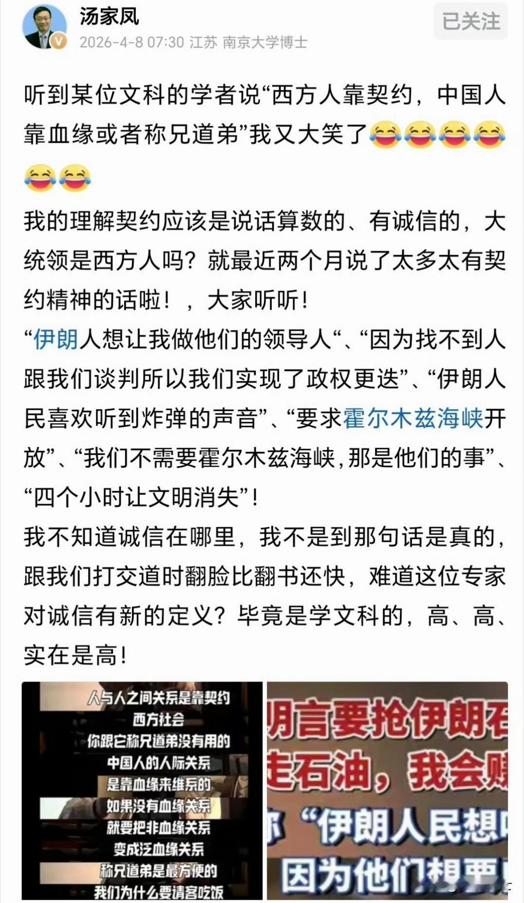 比如,汤家凤反驳易中天的言论,“西方靠契约精神,中国人只注重血缘关系或者称兄道弟”,西方的概念很大,易中天说的西方是指哪国呢?中国地域这么大,他说的中国又指哪里呢?