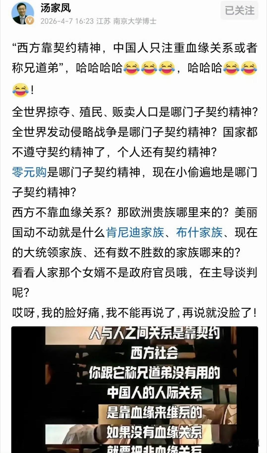 可惜啊,易中天这样的活在过去的人,思想被打了严重钢印的人,已经匍匐在他口中西方的脚下的人,脊椎断了再也长不直的人,是真的理解不了这些了,哪怕有人告诉他真相,他可能也不信。