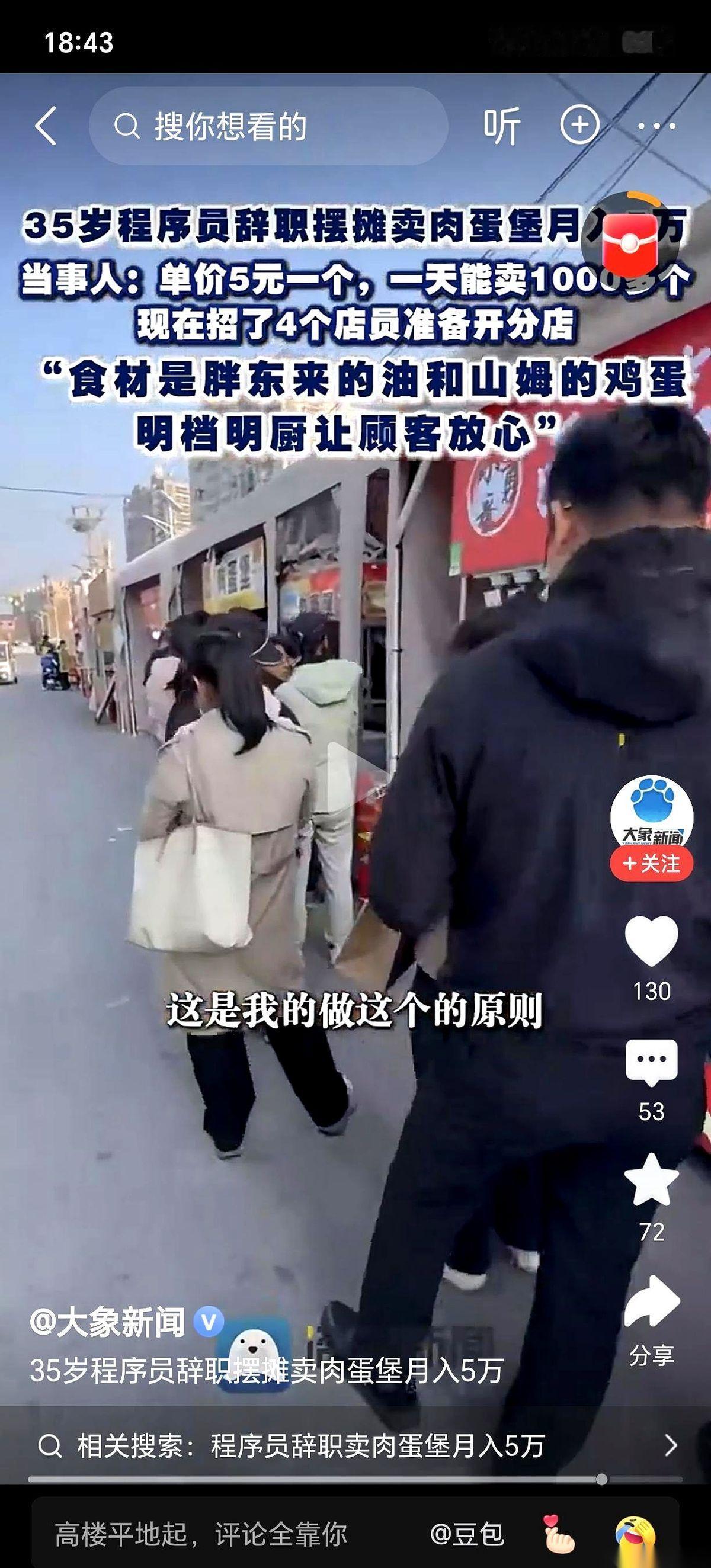 有个程序员,不敲代码了,跑去街边支了个小摊。 他一天就干一件事:把肉和蛋塞进饼里