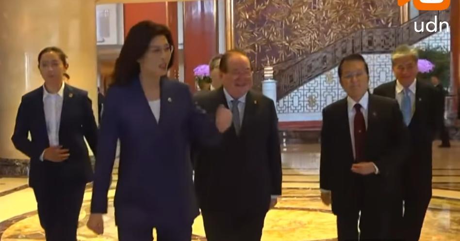 郑丽文出发前往人民大会堂这一幕很有意思。在酒店大堂有记者问她准备好了没。她咧嘴一笑:“我随时都准备好的。”