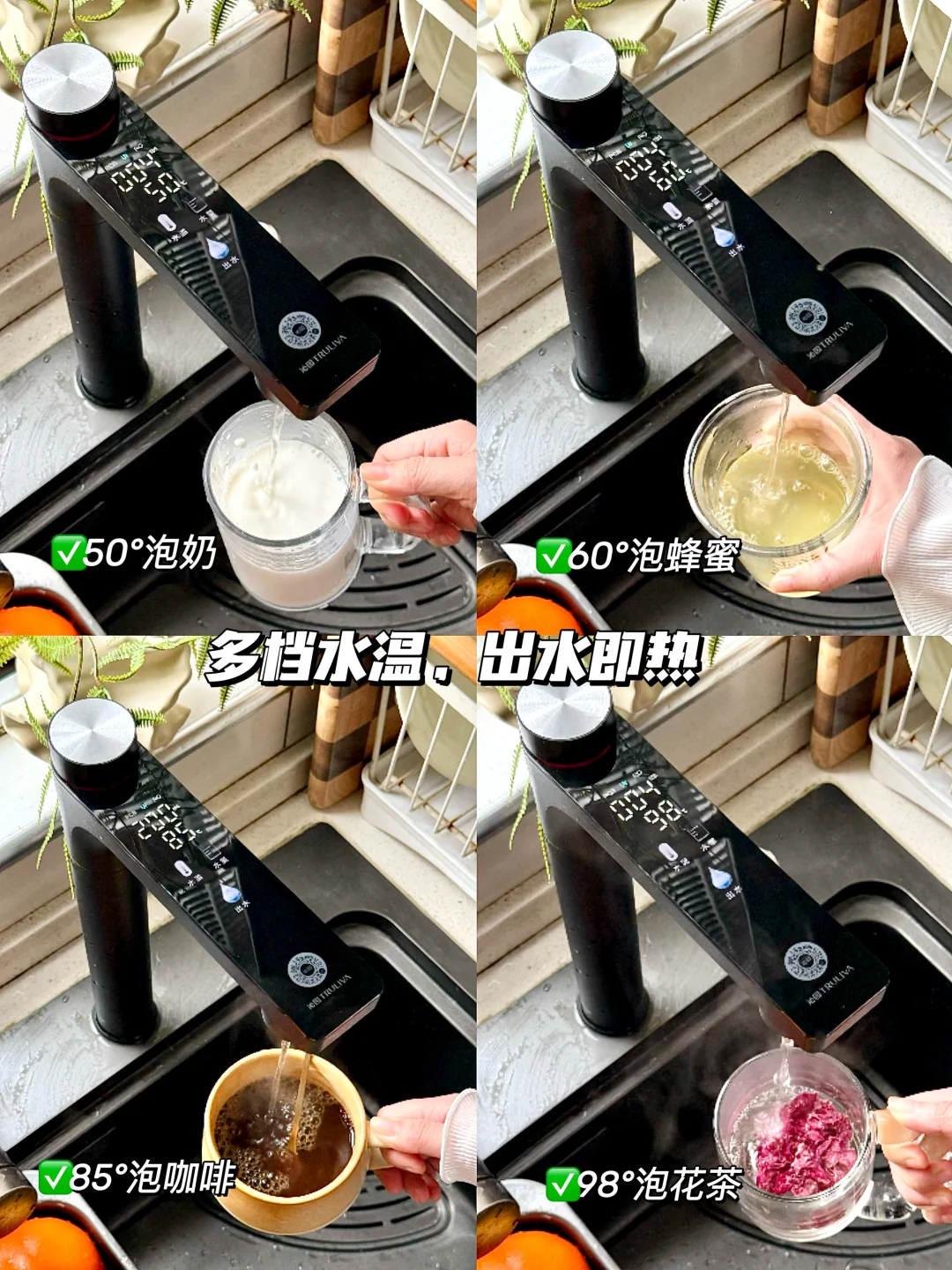 而且水温都能精准调,自带旋钮UV杀菌龙头,配备UV灭菌器,每次出水前都会进行二次杀菌,入口安心度拉满。右旋调水温、左旋调水量,湿手也能轻松拧,老人小孩一学就会!45℃泡奶、65℃泡花茶、98℃煮饭煲汤,温度水量随心调,全家不同用水需求这一台全满足。