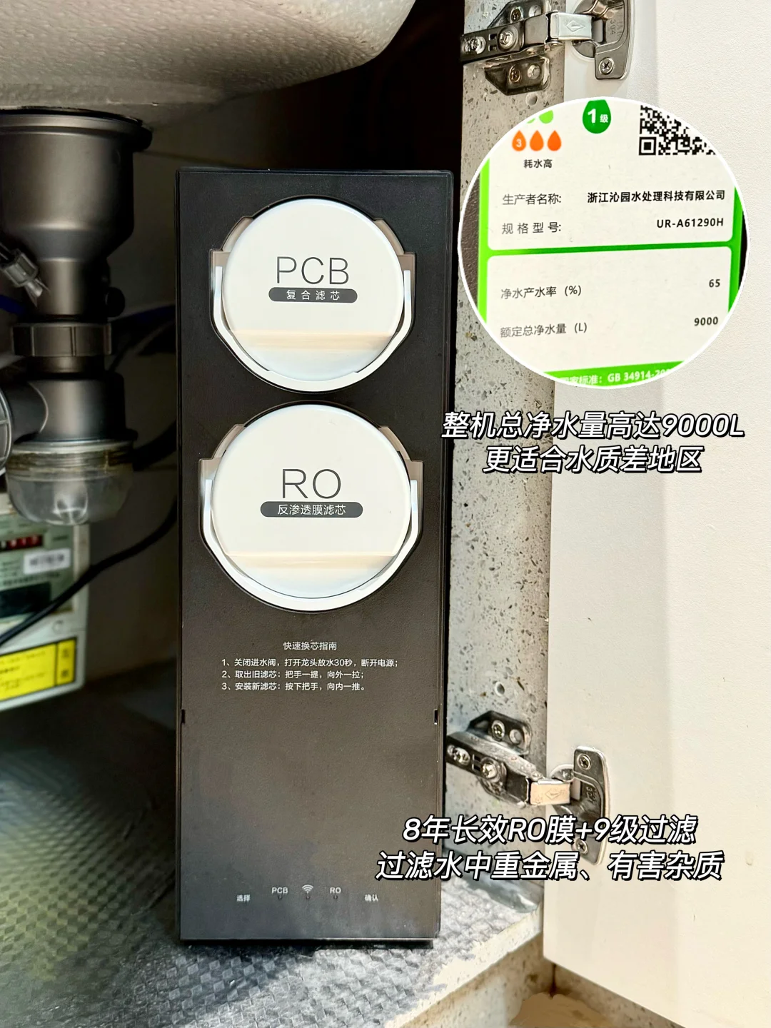 性能方面更是没得挑!9000L的超大额定总净水量,是国标一级的两倍,长效过滤性能依旧稳定,像我家这种水质偏硬的地区也能放心用。还有8年长效RO膜+双芯9级过滤,能滤除104种有害物,过滤效果99.9%,而且整机都是母婴认证的,家里有娃就放心用吧!