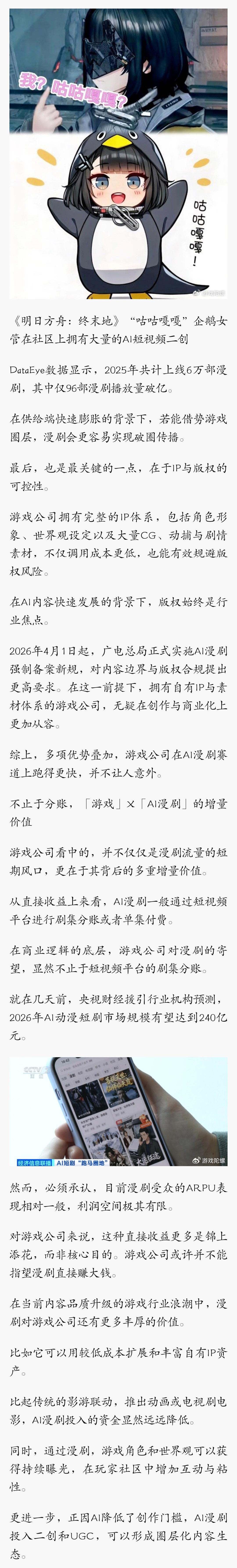 ·网易羚羊漫剧负责人庄镇指出,游戏IP的受众与漫剧观众高度重合,且付费意愿远高于一般的漫剧受众,更容易撬动流量。例如《明日方舟:终末地》“咕咕嘎嘎”企鹅女管在社区上拥有大量的AI短视频二创。