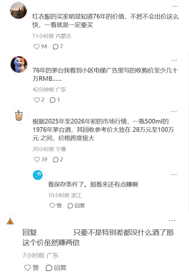 网友吐槽:红衣买家绝对早知道价值,不然不会拍得这么果断。小哥要是知道这酒至少能拍10万+,估计得悔哭!
