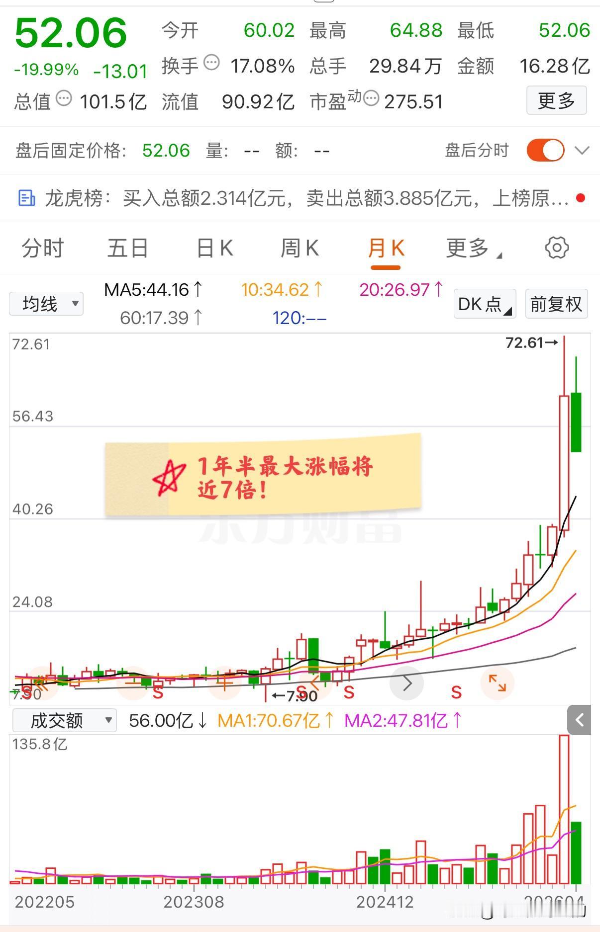 从月K上来看,该票从2024年8月开始启动,此后一路上涨,从最低的10.73元每股一直涨到了上个月底最高的72.61元每股,区间最大涨幅将近7倍!