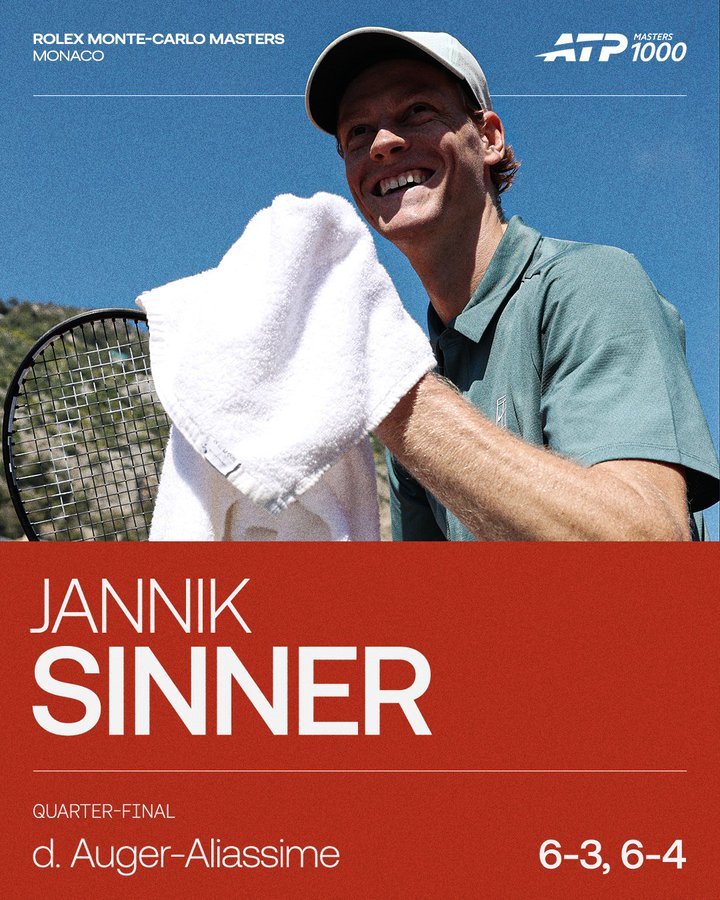 辛纳 蒙特卡洛大师赛,6-3/6-4阿利亚西姆,辛纳大师赛豪取20连胜 ,成为史上第四位取得过大师赛20连胜的球员(德费纳),他将战兹维列夫,后者7-5/6-7(3)/6-3击败巴西小将丰塞卡。这也是辛纳兹维列夫连续四个大师赛会师半决赛。