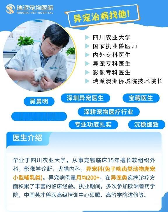 尤其是养异宠(兔子/鹦鹉等)的宝子,经常找不到懂异宠诊疗的医生,今天就给大家一位宝藏医生——吴景明医生,深圳异宠医生认准他,深圳靠谱宠物医生实锤,消除你的养宠就医烦恼~