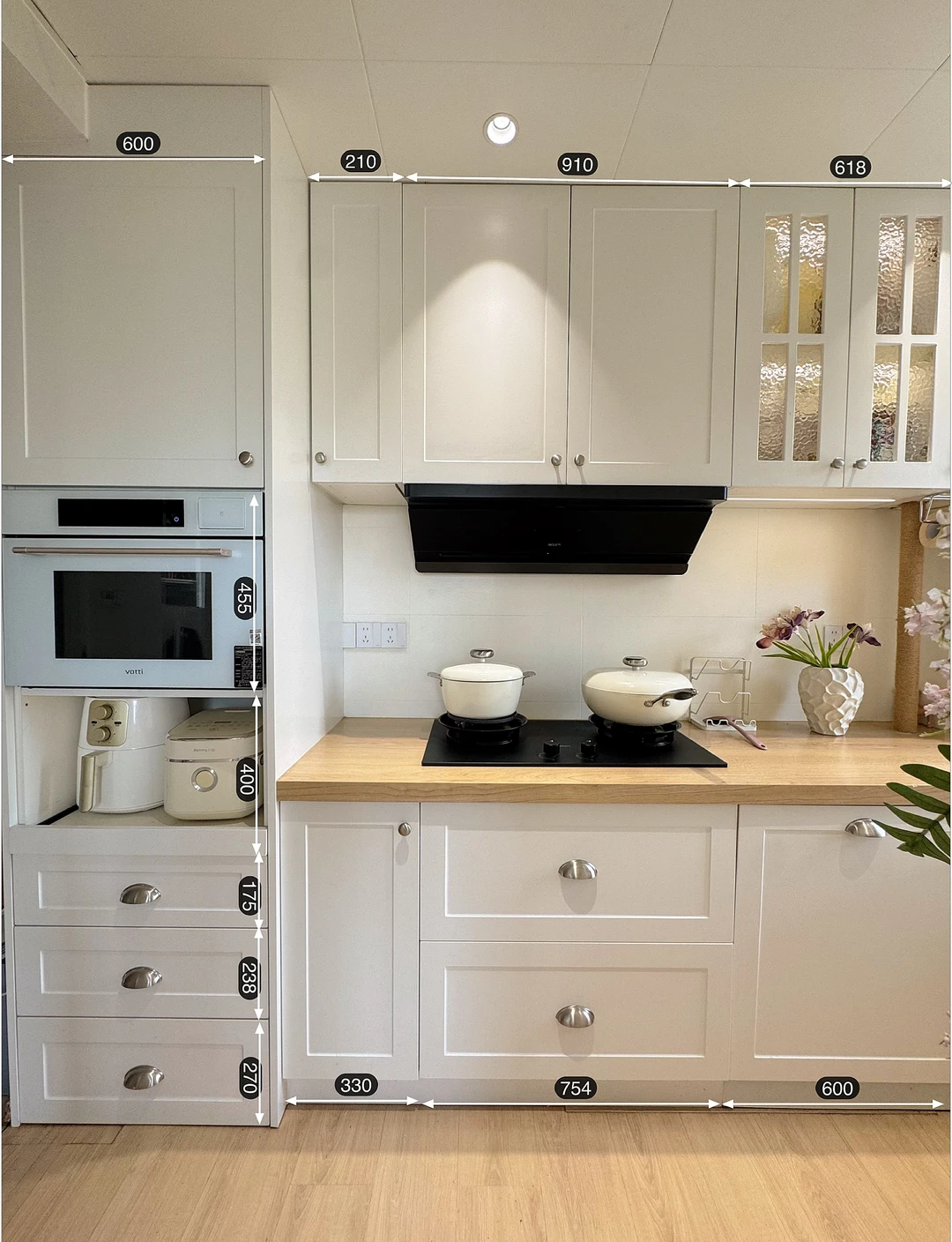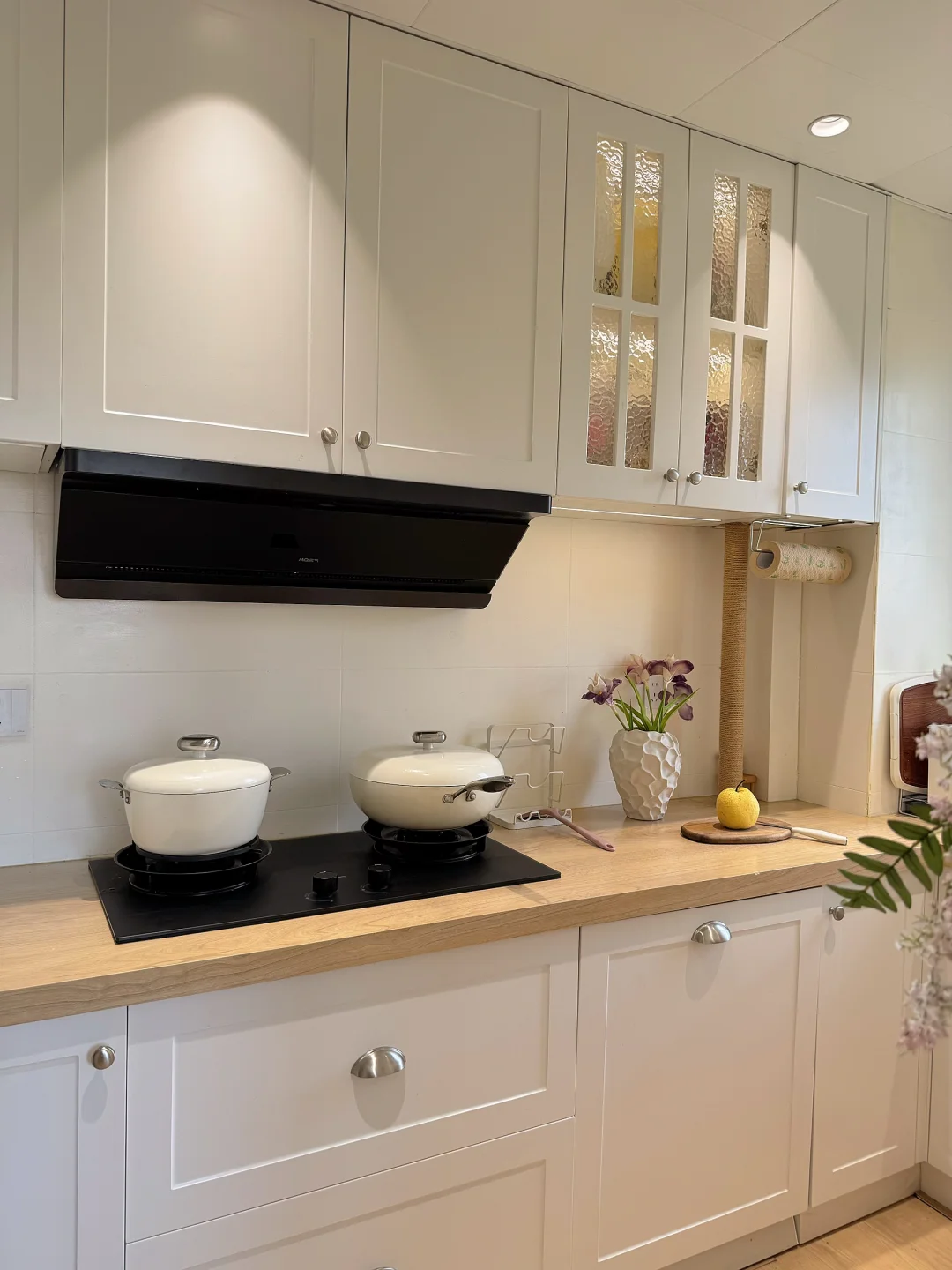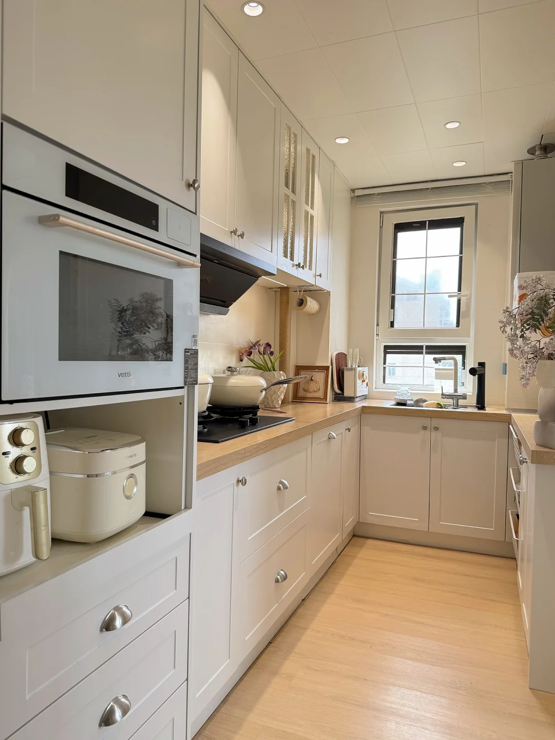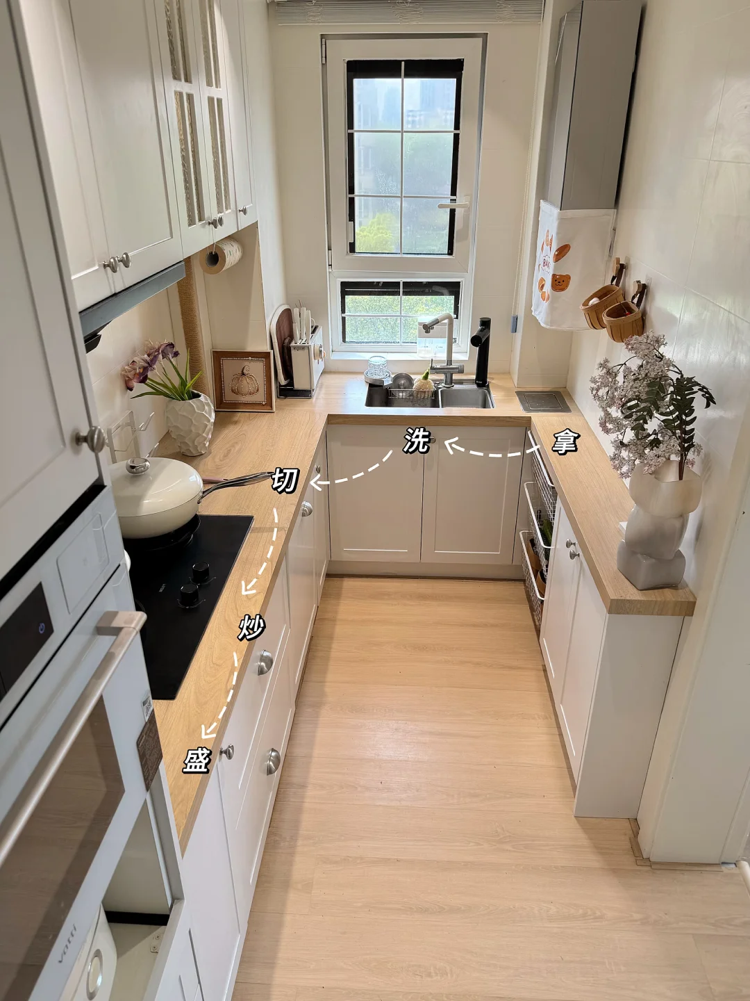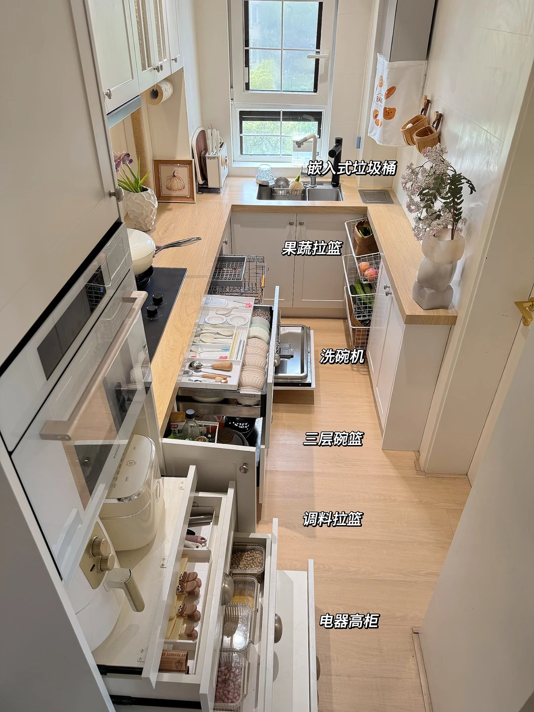 我重新规划了「拿-洗-切-炒-盛」黄金动线,不走回头路,用起来特别顺手!旁边还增加了电器高柜区,小家电、囤货全藏进去,台面干干净净,做饭心情都变好✨