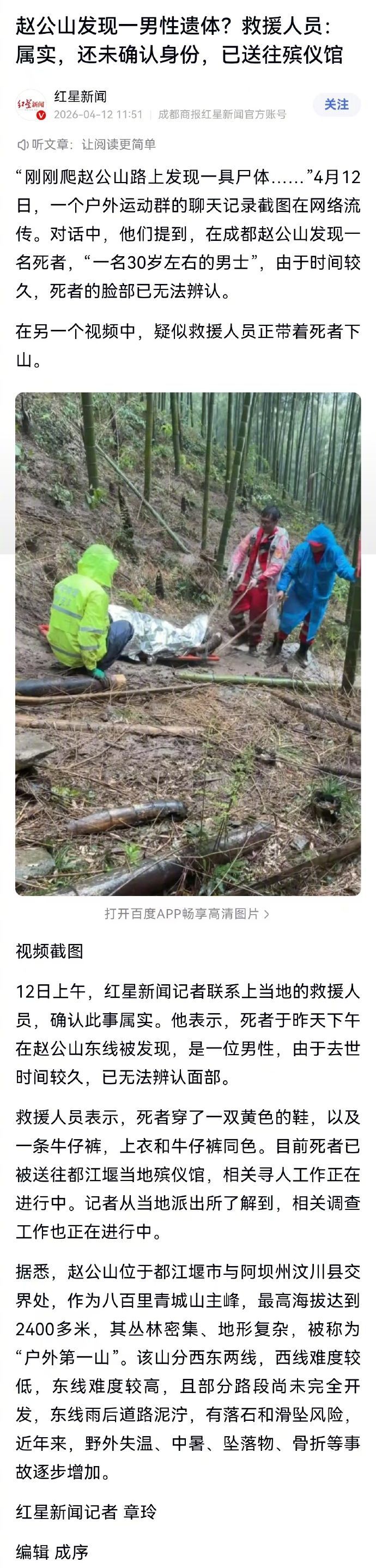 2日上午,红星新闻记者联系上当地的救援人员,确认此事属实。他表示,死者于昨天下午在赵公山东线被发现,是一位男性,由于去世时间较久,已无法辨认面部。