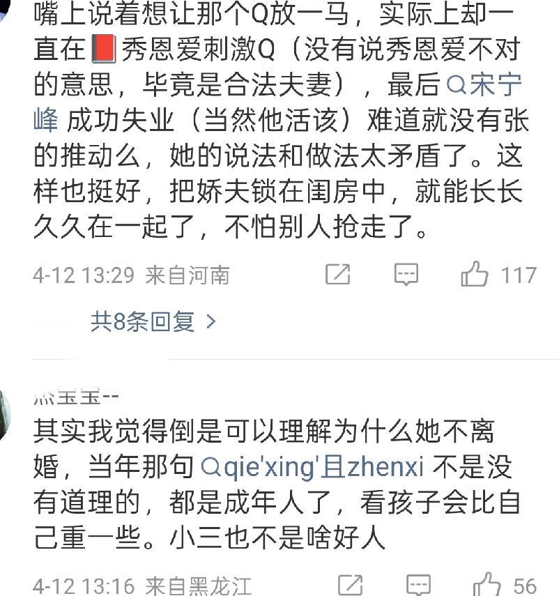 所以我个人认为,张婉婷一开始就没想离婚,也做好了被曝光的打算,因为宋宁峰赚的钱一直不多,家里的经济大部分还是靠她,所以宋宁峰退不退圈无所谓,但丑闻曝光退圈了,就能被她完全掌控了。