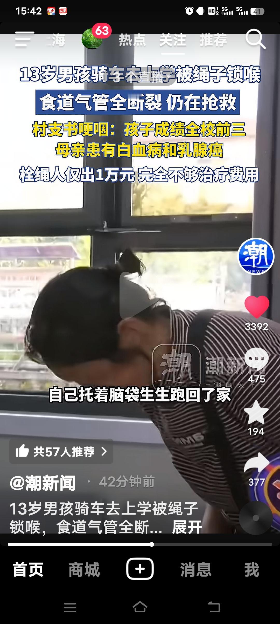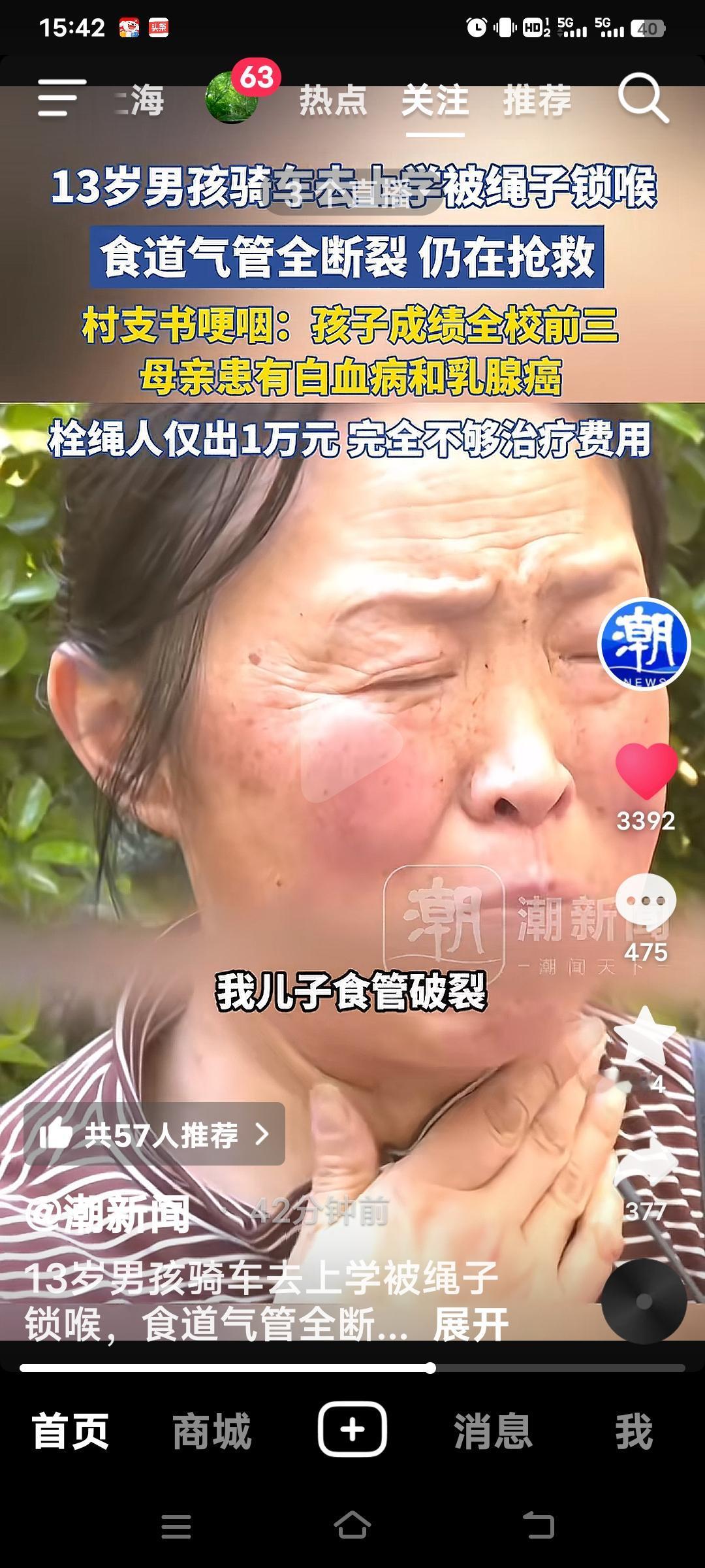 实在是太令人悲伤了,河南一个13岁的男孩骑车去上学,竟被绳子锁喉,食道和气管全部断裂。原来是有一家人打玉米时用绳子拦住了村道,这孩子骑车路过,不幸被绳子锁住。他强忍着剧痛回到了家中。