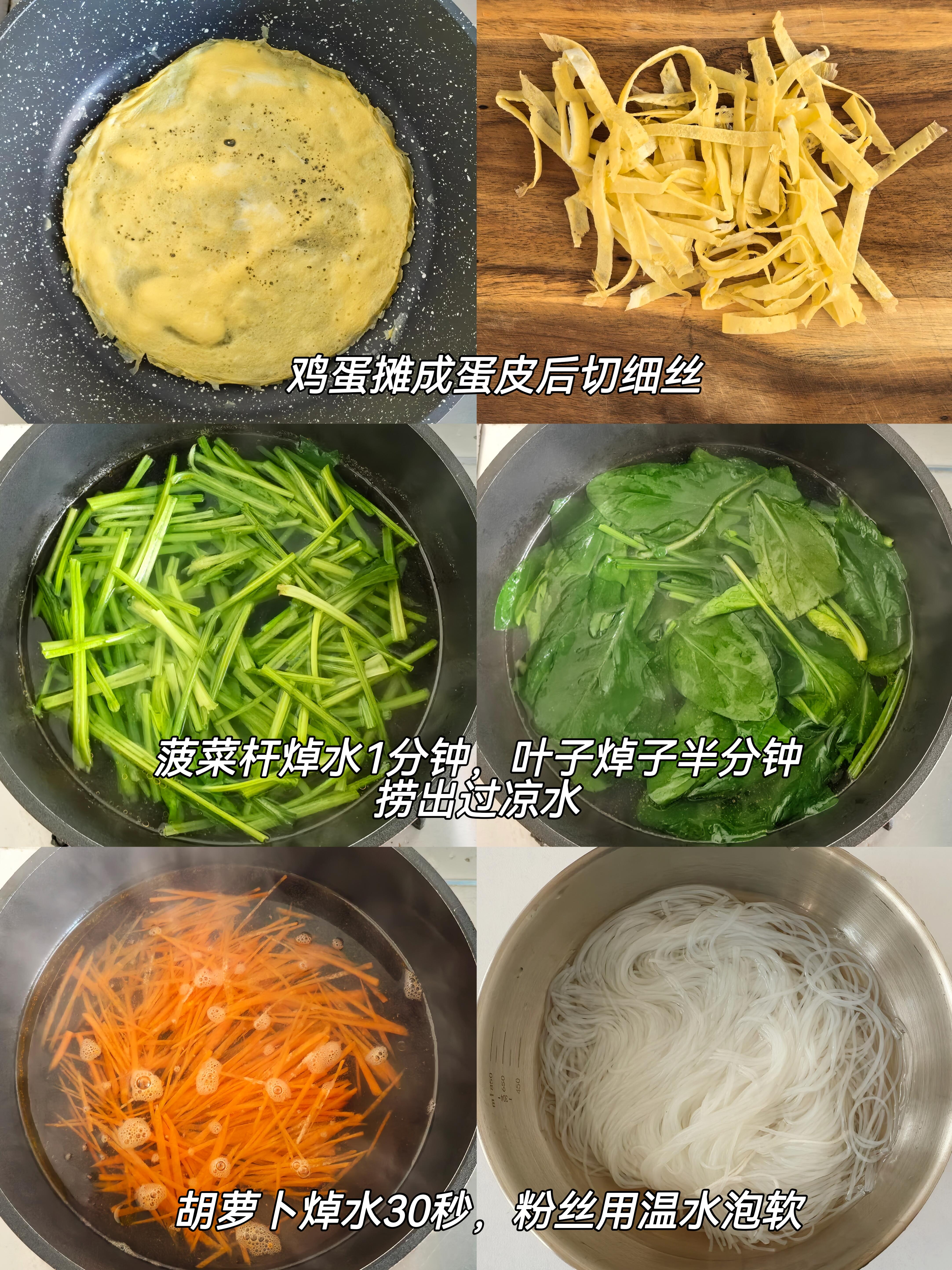 1️⃣鸡蛋打散,锅中刷少许油,摊成薄薄的蛋皮,放凉后切成细丝;胡萝卜洗净切成细丝,菠菜洗净后切成小段,分杆和叶备用。