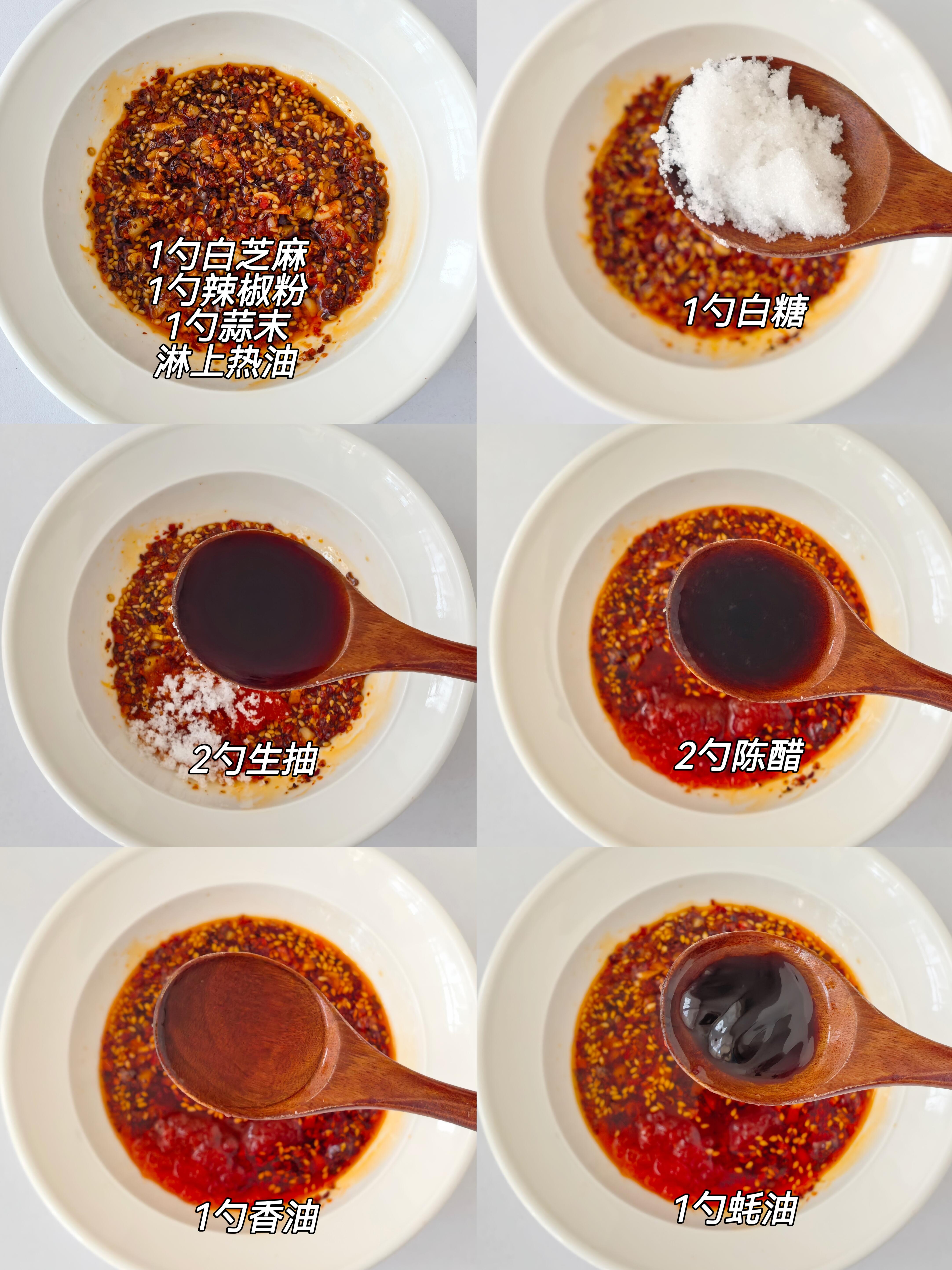 1勺白芝麻+1勺辣椒粉+1勺蒜末,淋上滚烫热油激香;再加入2勺生抽+2勺陈醋+1勺蚝油+1勺白糖+1勺香油,搅拌均匀即可。