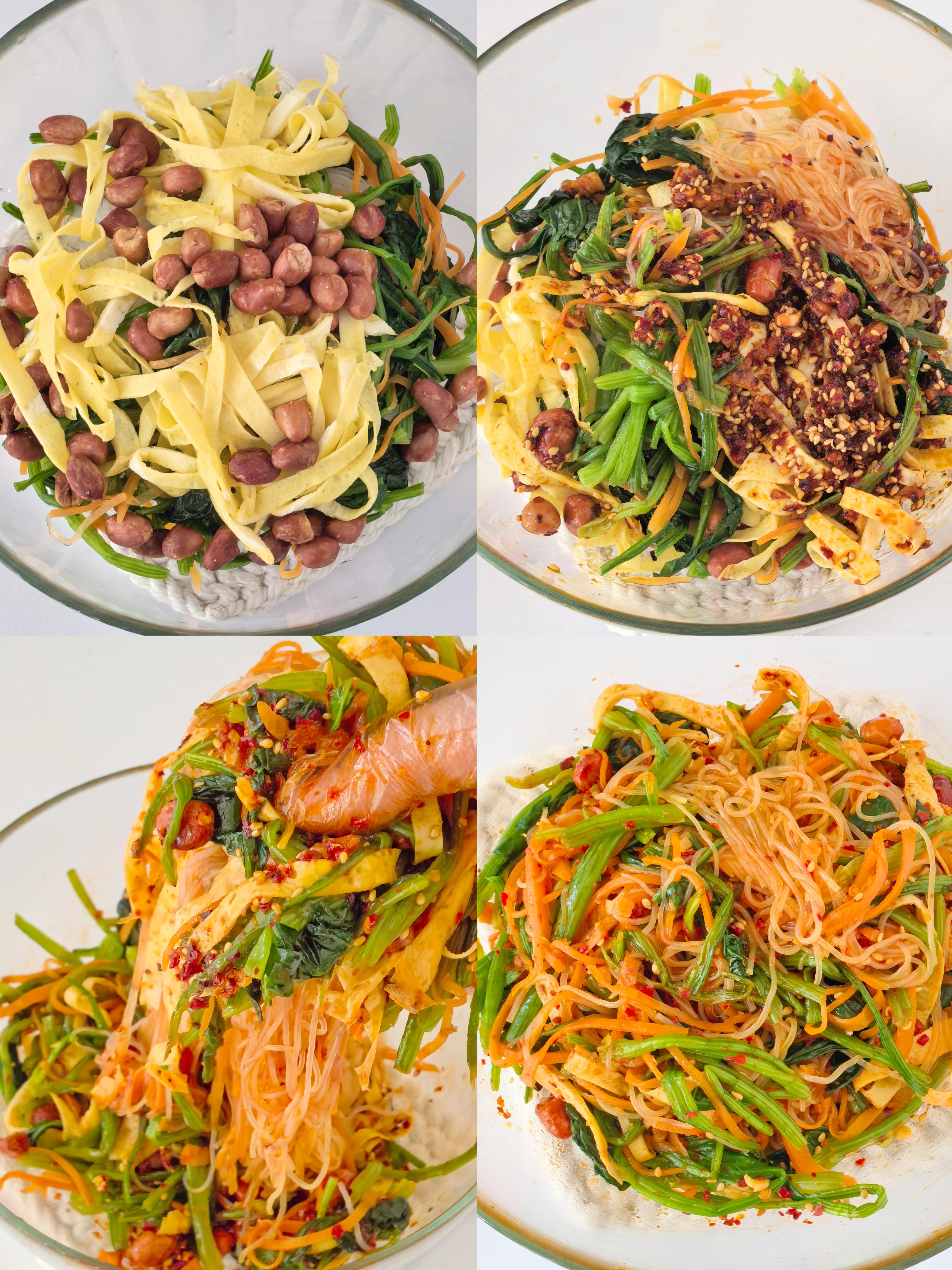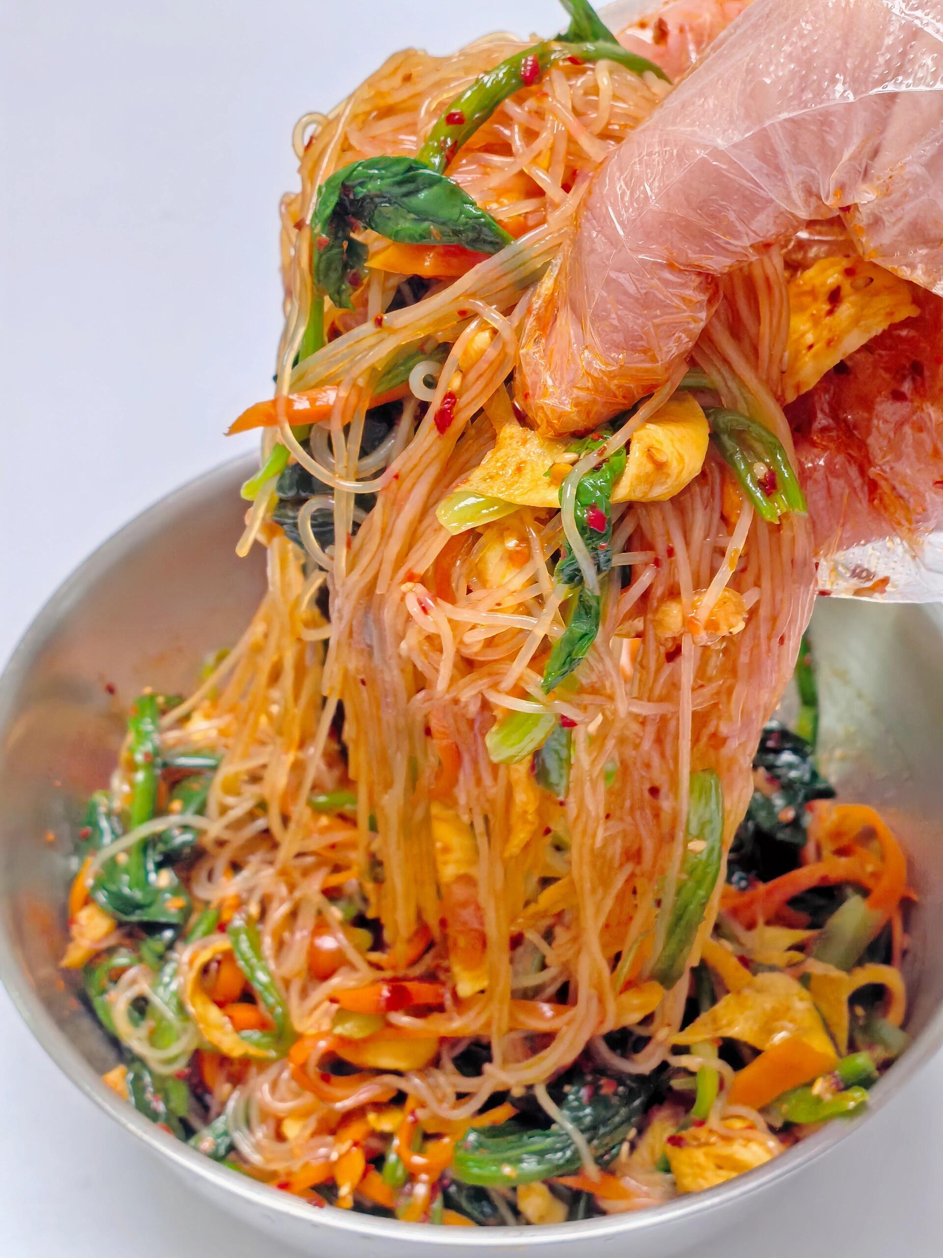 4️⃣ 把处理好的菠菜、粉丝、胡萝卜丝、蛋皮丝全部放进一个大碗里,倒入调好的灵魂酱汁,用筷子充分抓拌均匀,让每一种食材都裹满酱汁,直接开炫就好啦!
