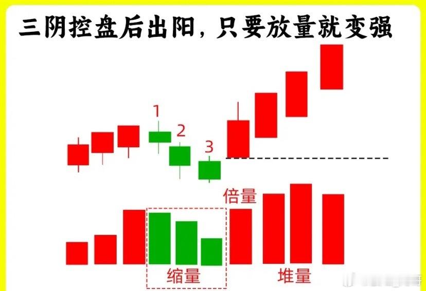 在上涨趋势里或是股价低位横盘阶段,股价线先是小幅度上涨以后,随后出现连续的三天阴线,同时成交量出现缩量,阴线的实体开始逐步缩小,同时都没有跌破重要支撑位,比如重要均线,高点等等,这是主力控盘表现,也是主力洗盘的形态,随后股价再次出现倍量阳线,出现阳线反包,说明主力洗盘完毕,多方力量开始强势
