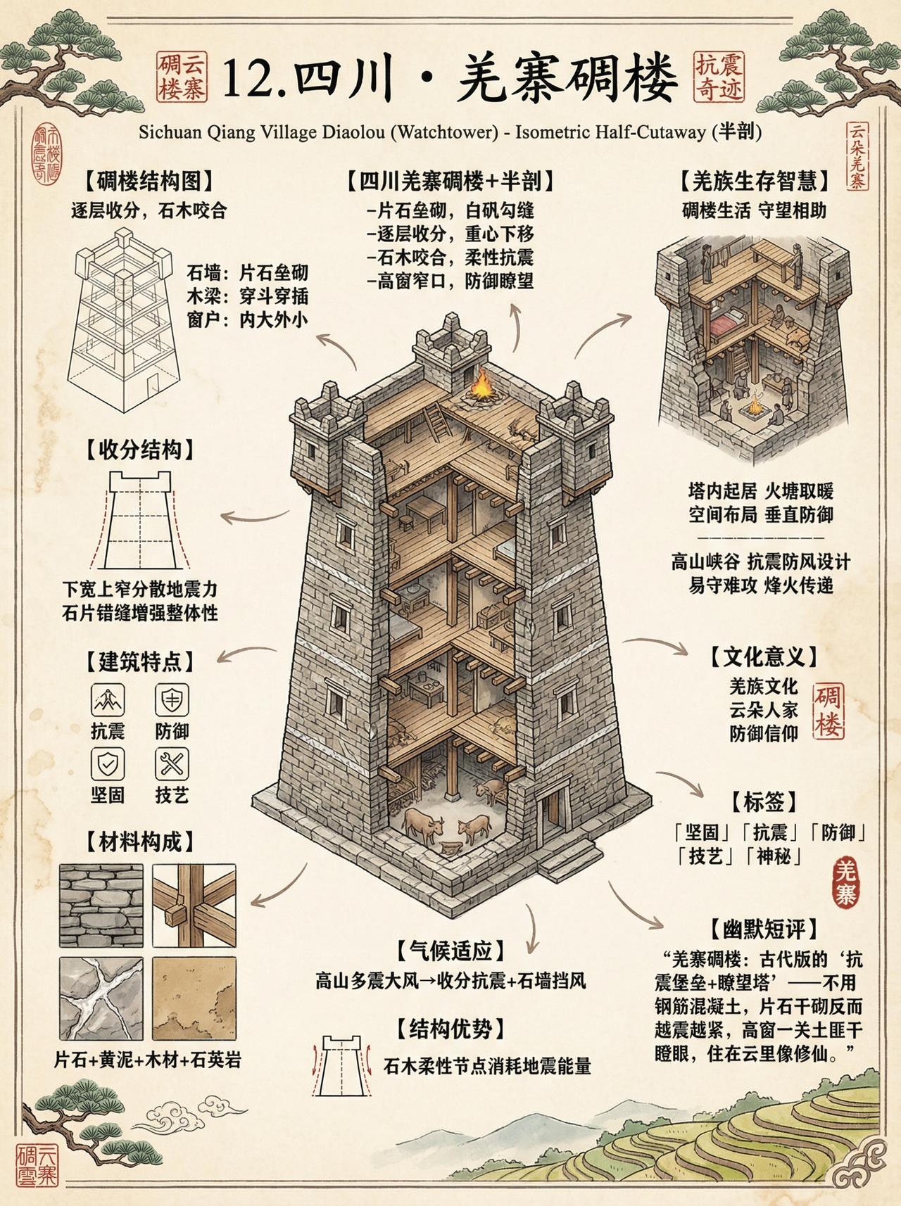 🏠 羌寨碉楼,是石片垒起的抗震神话,下宽上窄,在川西高山里守护了羌族千年;