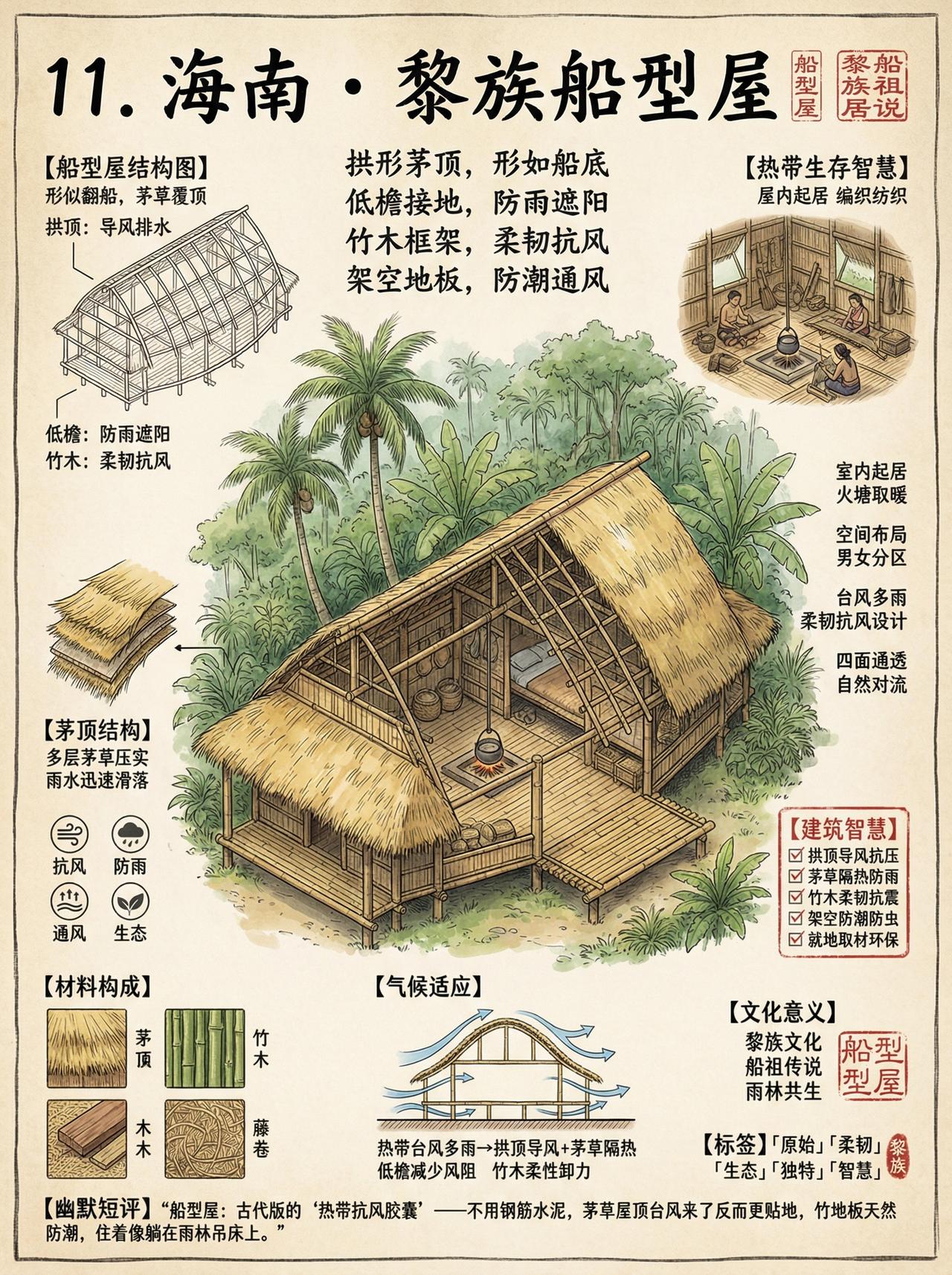 🏠 海南船型屋,是拱形茅顶的黎族传奇,架空防潮,在台风里守护了船祖的传说。