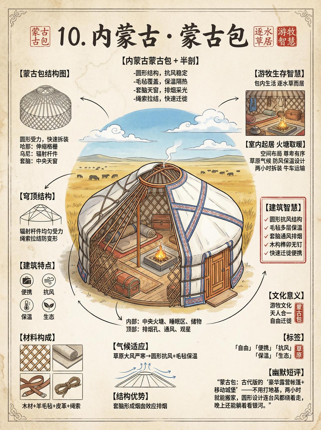 它们是气候的答案:北方厚墙抗寒,南方架空防潮,高原碉房抗风,草原穹庐抗风;