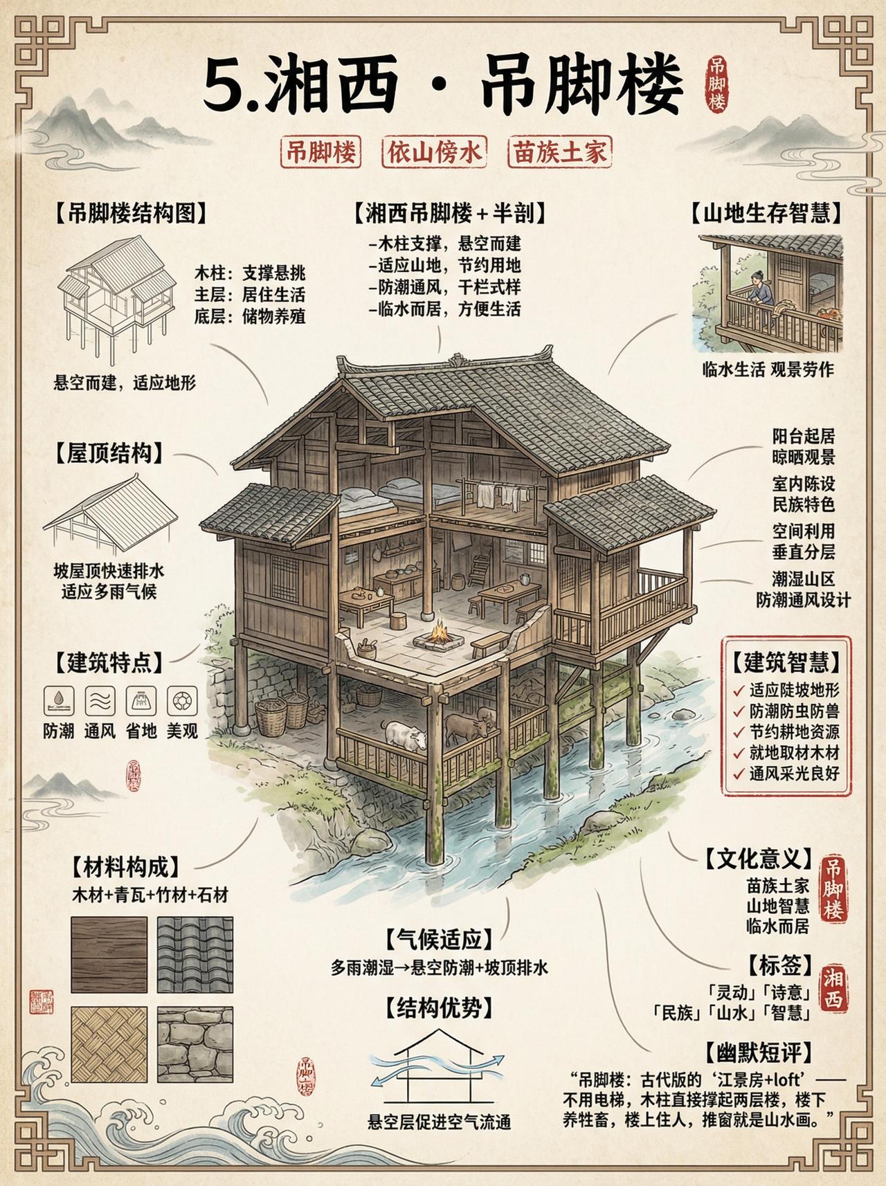 🏠 湘西吊脚楼,是依山傍水的灵动智慧,悬空而立,让苗族土家族的生活在山水间生长;