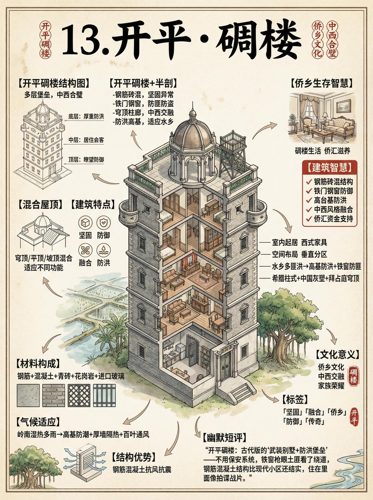 🏠 开平碉楼,是中西合璧的侨乡传奇,铁窗穹顶,刻着近代中国人闯荡世界的家国情怀;